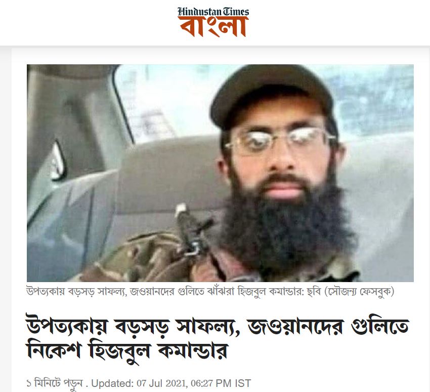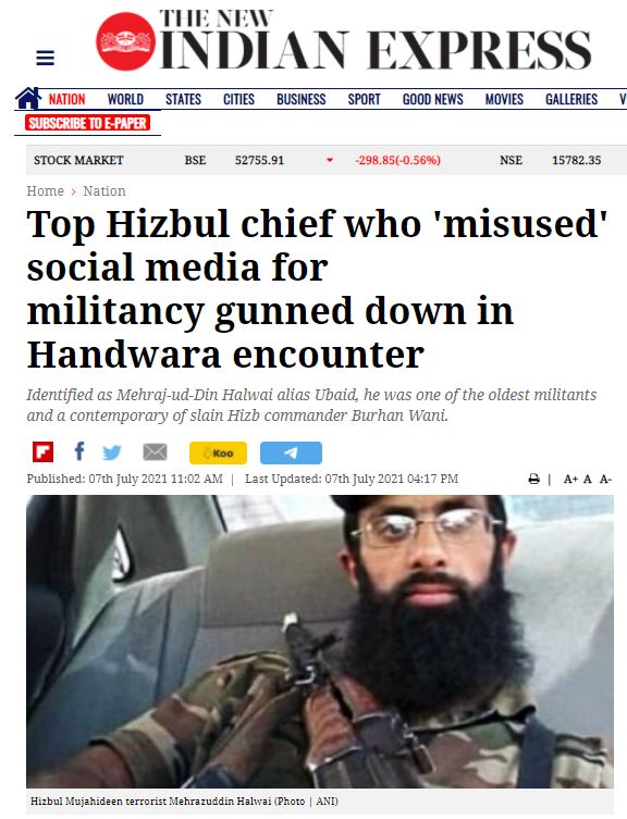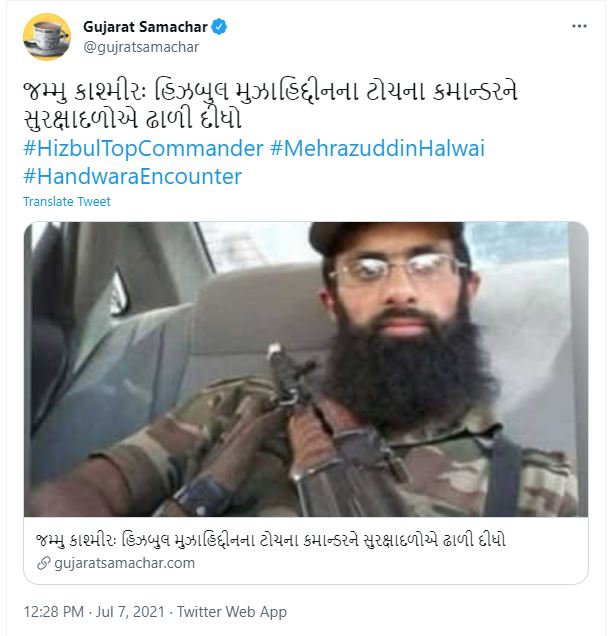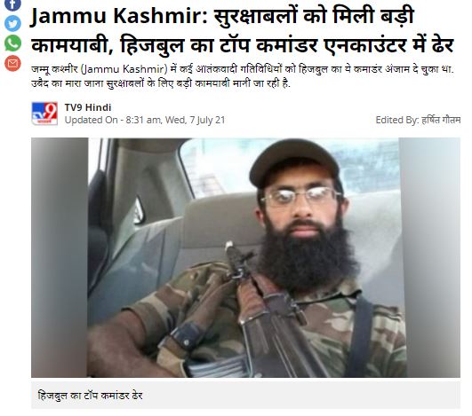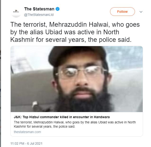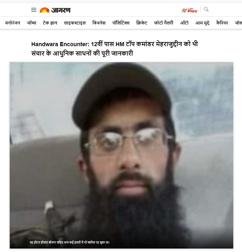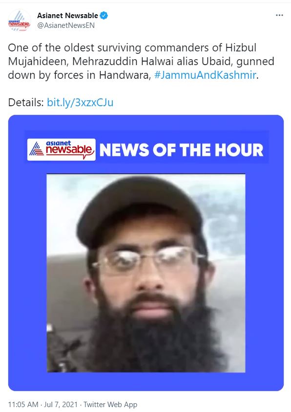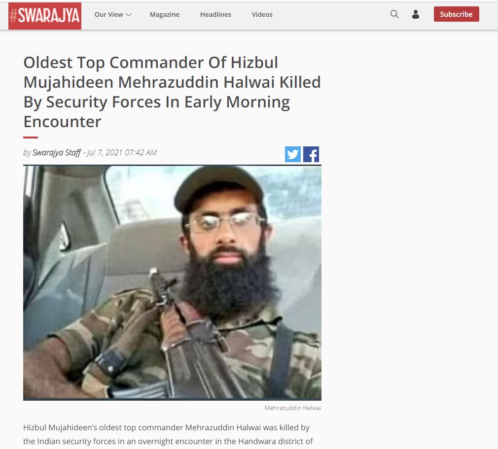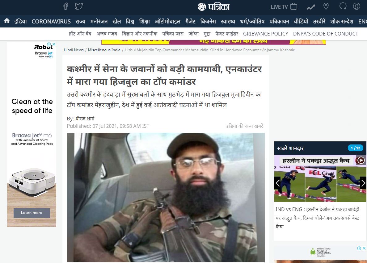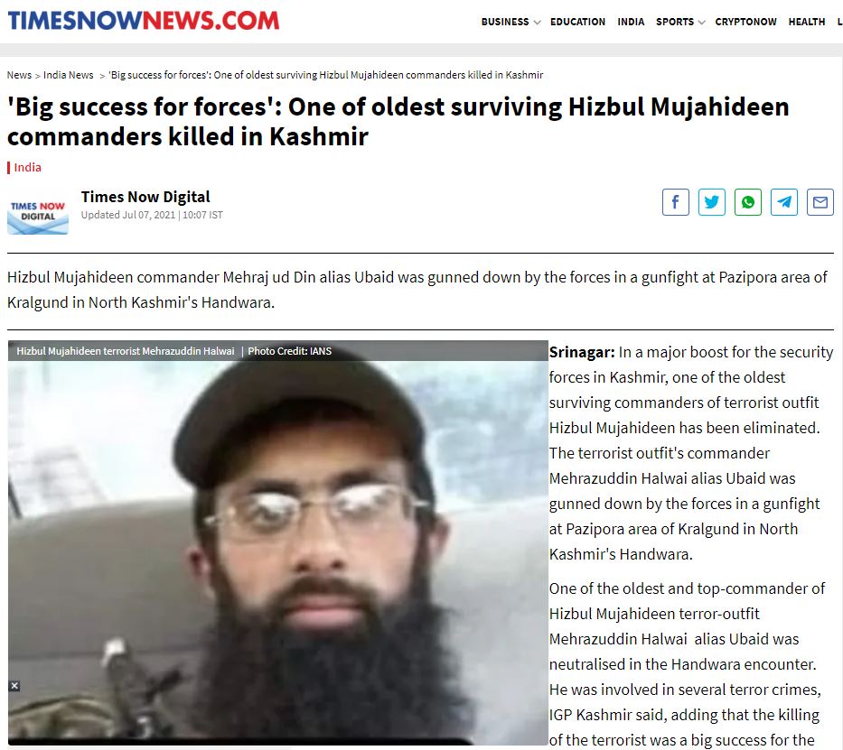 ख़बरों के अनुसार, 7 जुलाई की सुबह उत्तरी कश्मीर के हंदवाडा ज़िले में हुई एक मुठभेड़ में सुरक्षाबलों ने हिज़बुल मुजाहिदीन के कमांडर मेहराज़ुद्दीन हलवाई उर्फ उबैद को मार गिराया. इस घटना की जानकारी देते हुए टाइम्स नाउ, लल्लनटॉप, पत्रिका, जागरण, हिंदुस्तान टाइम्स बांग्ला, IANS, टीवी9 भारतवर्ष, द न्यू इंडियन एक्सप्रेस, गुजरात समाचार, द स्टेट्समैन, एशियानेट, स्वराज्य इत्यादि ने मेहराजुद्दीन की बताते हुए एक तस्वीर भी शेयर की.