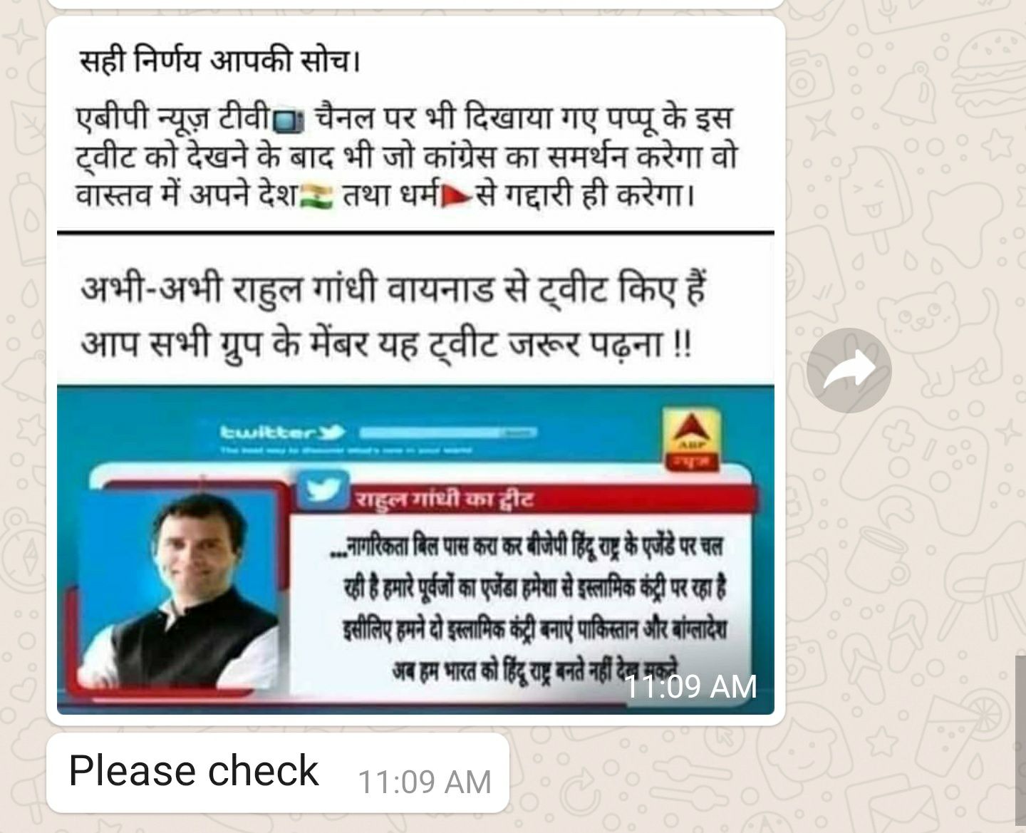 एबीपी न्यूज का एक कथित ग्राफ़िक वायनाड के सांसद राहुल गांधी के एक ट्वीट के साथ वायरल हो रहा है. स्क्रीनशॉट के ऊपर दो कैप्शन हैं. पहले में लिखा है, “सही निर्णय आपकी सोच। एबीपी न्यूज़ टीवी चैनल पर भी दिखाया गए पप्पू के इस ट्वीट को देखने के बाद भी जो कांग्रेस का समर्थन करेगा वो वास्तव में अपने देश तथा धर्म) से गद्दारी ही करेगा.”
