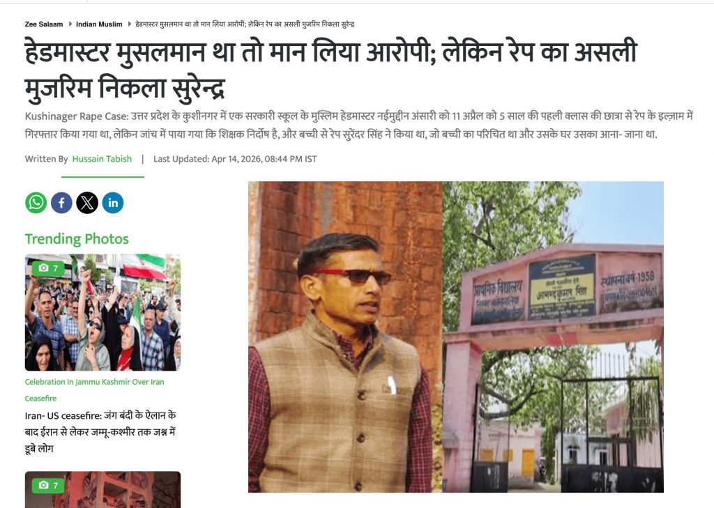 यानी, 5 साल की छात्रा के साथ किए गए दुष्कर्म के संबंध में परिजनों के आशंका और जन दबाव में पुलिस ने प्रधानाध्यापक नईमुद्दीन अंसारी को गिरफ्तार किया था, लेकिन पुलिस की जांच में सामने आया कि असली आरोपी सुरेन्द्र सिंह है और नईमुद्दीन अंसारी बेगुनाह है. लेकिन राइट विंग हैंडल्स और हिंदू-मुस्लिम प्रॉपगेंडा आधारित न्यूज़ चैनल ने बिना अरोप साबित हुए नईमुद्दीन अंसारी को ही आरोपी बताते हुए पूरे मुस्लिम समुदाय पर निशाना बनाने वाले अपमानजनक शब्दों का इस्तेमाल करने लगे.