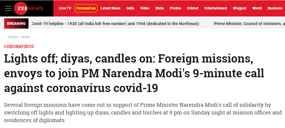 अफ़गानिस्तान, नेपाल, भूटान, बांग्लादेश, मालदीव, वियतनाम, जापान, ऑस्ट्रेलिया, इज़रायल, जर्मनी, ट्यूनीशिया और मैक्सिको के विदेशी मिशन ने ‘ज़ी मीडिया’ को बताया कि वो सभी पीएम मोदी की इस मुहिम में हिस्सा लेंगे. ‘ज़ी न्यूज़’ ने अपनी रिपोर्ट में बताया, “कई विदेशी मिशन ने प्रधानमंत्री नरेंद्र मोदी की उस मुहिम में हिस्सा लिया था जिसमें 5 अप्रैल को रात 9 बजे 9 मिनट के लिए दिया, मोमबत्ती, टॉर्च जलाने की अपील की थी. रविवार की रात को मिशन ऑफ़िस और राजनायिकों के घर पर दिये जलाए गए थे.”