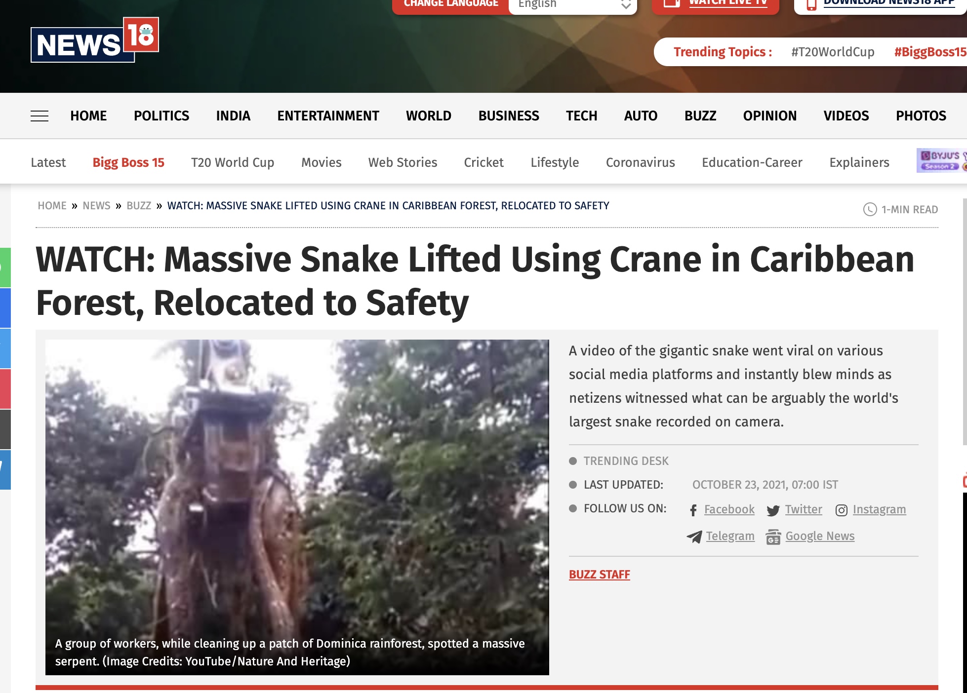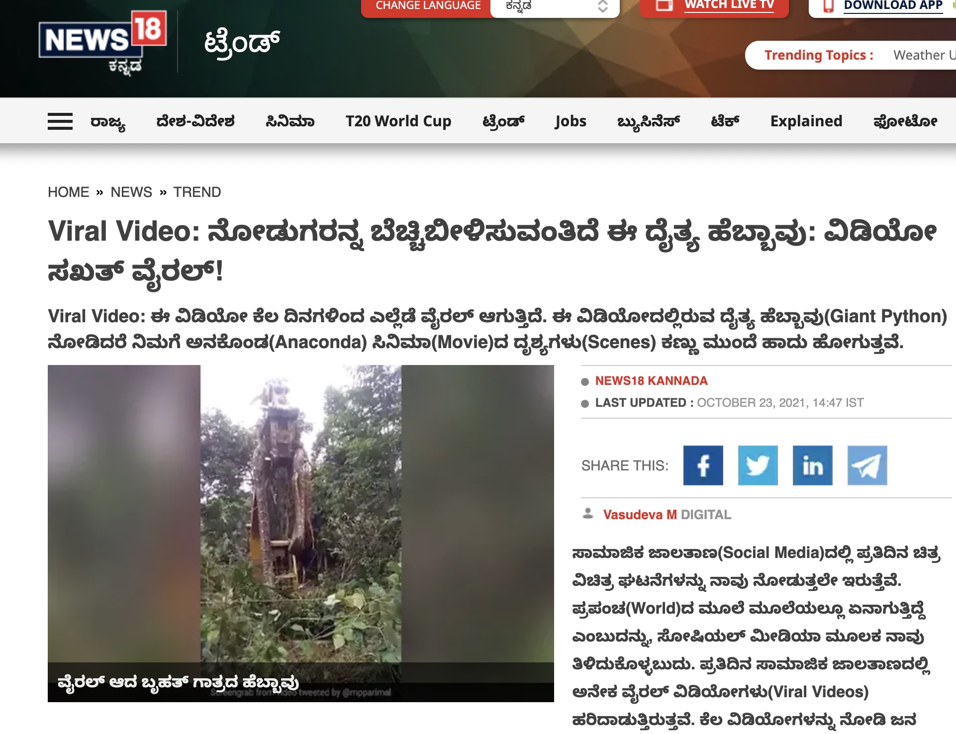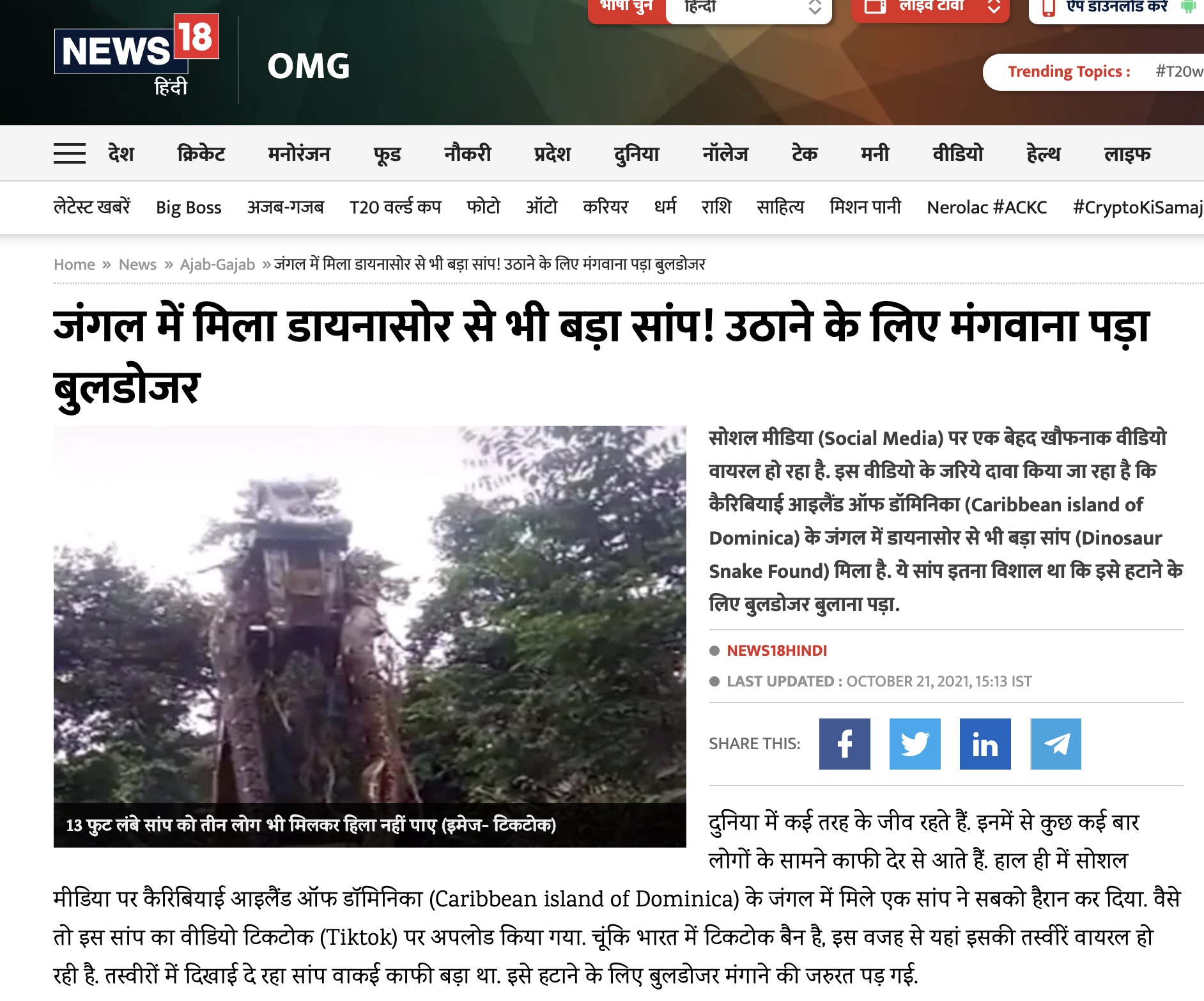 एक हफ़्ते बाद न्यूज़18, न्यूज़18 कन्नड़ा और न्यूज़18 हिंदी ने यही वीडियो पब्लिश किया जिसमें कहा गया कि ये करीबियन के एक वर्षावन का है. इसे रिपब्लिक, आज तक बांग्ला और टीवी9 मराठी ने भी पब्लिश किया गया था.