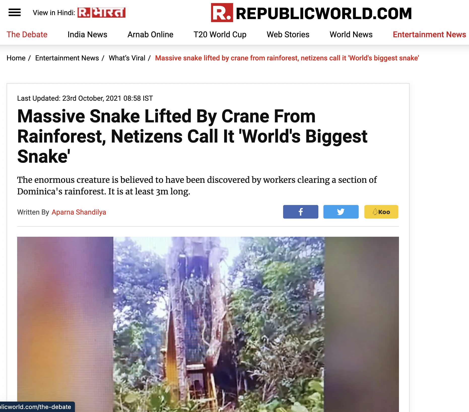12 अक्टूबर को, इक्वाडोर स्थित फ़ेसबुक पेज Amazonía Informa ने भी बिना संदर्भ बताये ये वीडियो अपलोड किया था. एक फ़ेसबुक यूज़र ने दावा करते हुए पोस्ट किया कि ये वीडियो करीबियन सागर के एक द्वीपीय देश डोमिनिका का है. जिसके कुछ दिनों बाद, 20 अक्टूबर के आस-पास, यूके स्थित समाचार आउटलेट मेट्रो, सन और यूएस के न्यूयॉर्क पोस्ट ने रिपोर्ट पब्लिश की जिसमें दावा किया गया कि वीडियो डोमिनिका का है.