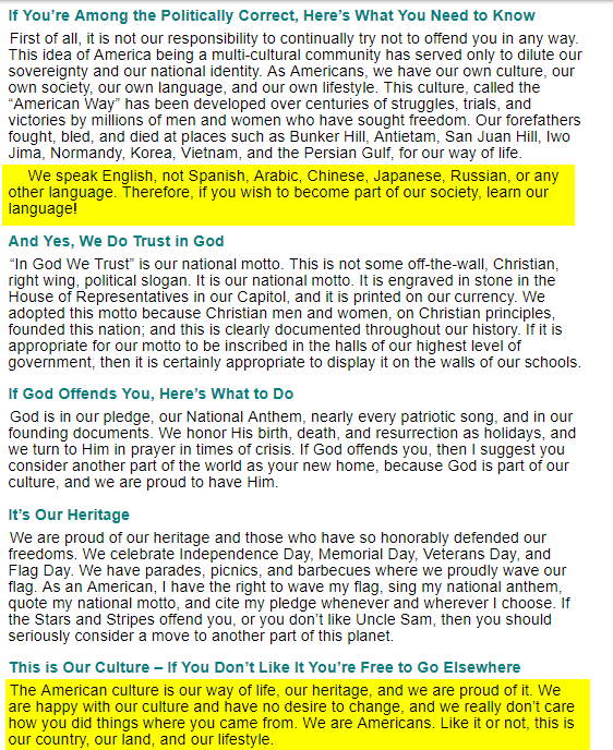 हम यहां अंग्रेजी भाषा बोलते हैं, ना कि अरबी या उर्दू या किसी भी अन्य प्रकार की इस्लामी भाषा, इसलिए यदि आप हमारे देश में रहना चाहते हैं तो आप बेहतर तरीके से अंग्रेजी बोलना सीख लें।