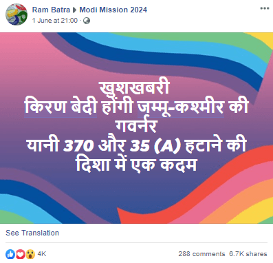 ‘मोदी मिशन 2024’ नाम के एक फेसबुक पेज ने भी 1 जून को यही दावा साझा किया था, जिसमें लिखा था कि,“खुशखबरी. किरण बेदी होंगी जम्मू-कश्मीर की गवर्नर. यानी 370 और 35 (A) हटाने की दिशा में एक कदम”– इस पोस्ट को करीब 4000 बार लाइक और 6700 बार शेयर किया गया है।