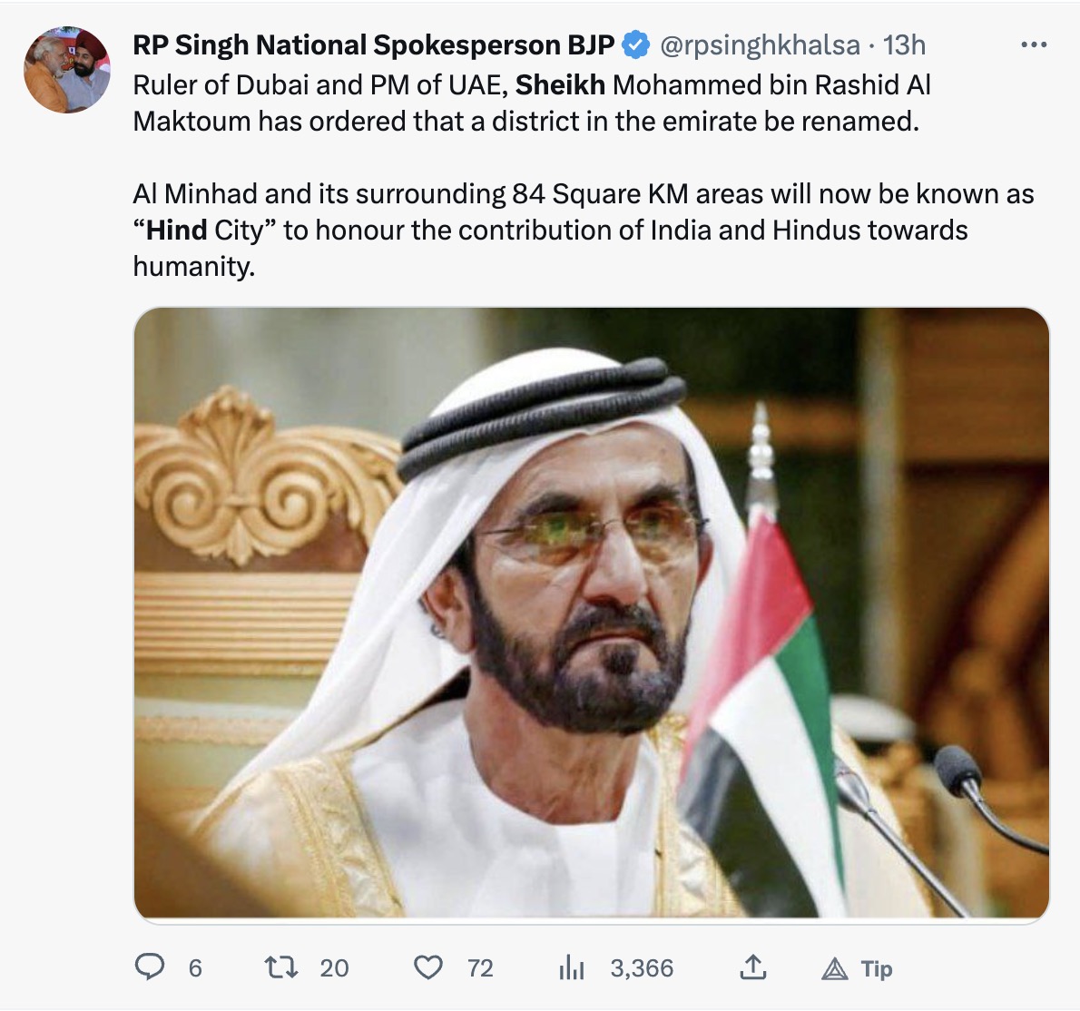 इसी खबर का हवाला देते हुए, WION संवाददाता सिद्धांत सिब्बल ने ट्वीट किया, “उन्होंने [पीएम] अपनी पत्नी, शिखा हिंद बिन्त मकतूम बिन जुमा के नाम पर इस जगह का नाम बदल दिया है. हिंद एक आम अरबी महिला नाम है. दुबई मीडिया कार्यालय द्वारा नाम बदलने की घोषणा की गई. उन्होंने इस ख़बर के लिए किसी सोर्स का हवाला नहीं दिया कि शहर का नाम बदलकर पीएम की पत्नी के नाम पर रखा गया था.