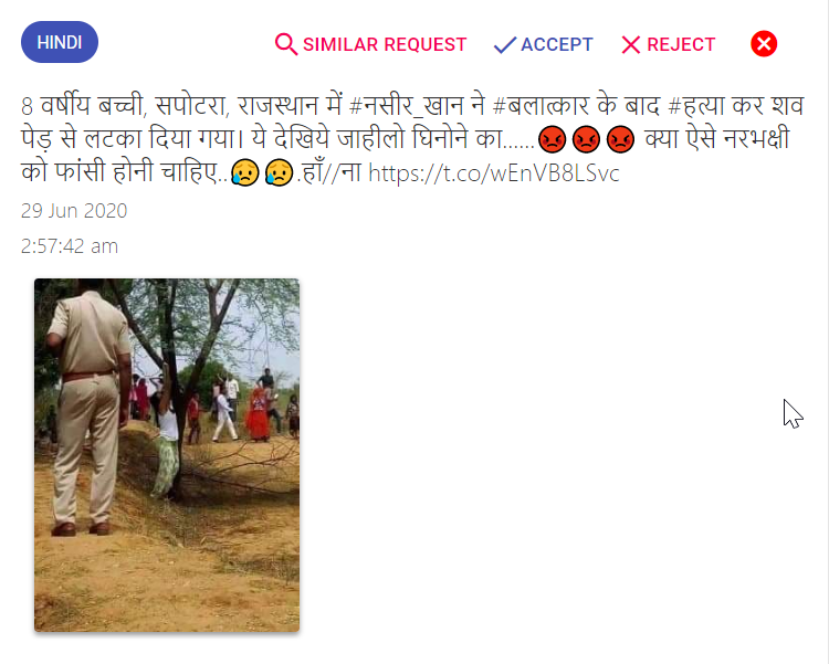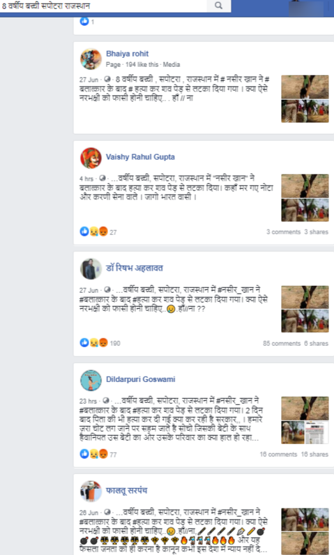 पेड़ से लटकी हुई एक लड़की की लाश की 2 तस्वीरें सोशल मीडिया में इस दावे से शेयर हो रही हैं कि राजस्थान के सपोटरा में नसीर खान नाम के एक व्यक्ति ने 8 वर्षीय लड़की का बलात्कार कर उसकी हत्या कर दी. ये तस्वीरें एक कॉमन मेसेज के साथ खूब शेयर हो रही हैं – “8 वर्षीय बच्ची , सपोटरा , राजस्थान में # नसीर खान ने # बलात्कार के बाद # हत्या कर शव पेड़ से लटका दिया गया।”