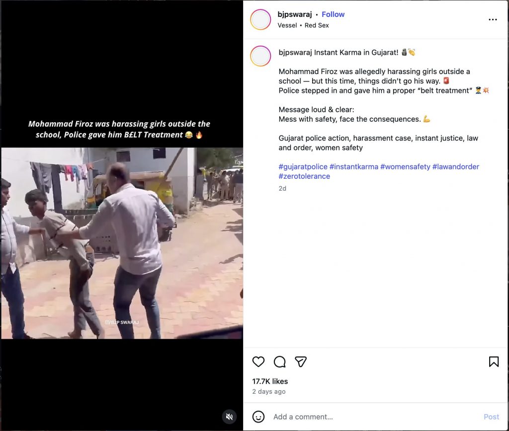 राइट विंग एक्स-हैंडल @HindutvaDon_ ने वीडियो शेयर करते हुए लिखा, “मोहम्मद फ़िरोज़ स्कूल के बाहर लड़कियों को परेशान कर रहा था, पुलिस ने उसे बेल्ट कड़ी सजा दी.”