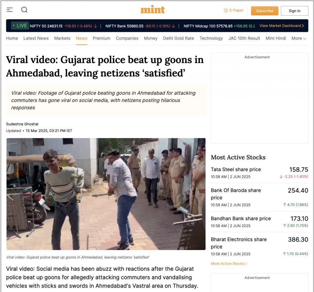 इसके अलावा, हमें लाइव मिंट की एक न्यूज़ रिपोर्ट मिली, जिसमें वीडियो के स्क्रीनग्रैब का इस्तेमाल किया गया है. इस ररेपोर्ट के मुताबिक, होली से ठीक एक दिन पहले, एक प्रत्यक्षदर्शी द्वारा फिल्माए गए वीडियो में 20 लोगों की भीड़ को एक SUV के मालिक पर हमला करते और तलवारों और लाठियों से आसपास के अन्य वाहनों को नुकसान पहुंचाते हुए दिखाया गया था. इसके बाद कार्रवाई करते हुए गुजरात पुलिस ने 14 आरोपियों को गिरफ़्तार किया और सरेआम उनकी पिटाई की. सोशल मीडिया पर इस कार्य के लिए गुजरात पुलिस की सराहना की जाने लगी.