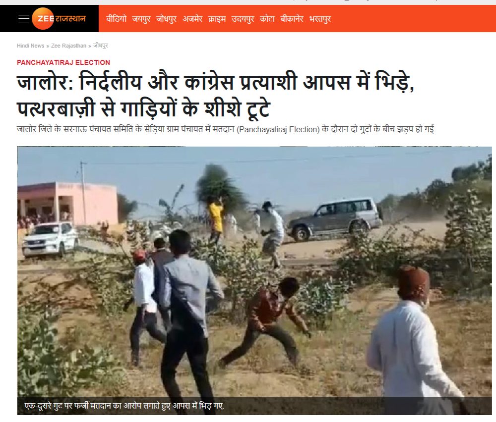 ऑल्ट न्यूज़ ने जब वीडियो के फ़्रेम्स का कीवर्ड के साथ रिवर्स इमेज सर्च किया तो हमें 28 नवम्बर, 2020 की एक रिपोर्ट मिली. इस रिपोर्ट में बताया गया है कि राजस्थान के जालोर जिले के सरनाऊ पंचायत समिति के सेड़िया ग्राम पंचायत में 27 नवम्बर, 2020 को मतदान के दौरान दो गुटों के बीच झड़प हो गई थी. रिपोर्ट में लिखा है, “झड़प में दोनों गुटों द्वारा एक-दूसरों पर पत्थरबाजी भी की, जिससे कांग्रेस प्रत्याशी की गाड़ी के शीशे तोड़ दिए गए एवं दो समर्थकों के हल्की चोटें भी आई.” ये तनातनी हुई कांग्रेस सदस्य मोहन कुमार और सुरेश वियाग की वजह से. मोहन कुमार प्रदेश कांग्रेस कमिटी के पूर्व सदस्य हैं और सुरेश वियाग जिला कांग्रेस महासचिव हैं. इन दोनों की माताएं सेड़िया ग्राम पंचायत में प्रत्याशी थीं. मतदान के दौरान दोनों पक्षों के समर्थकों ने एक दूसरे पर फ़र्ज़ी वोटिंग का आरोप लगाया जिसके बाद झड़प हो गयी.