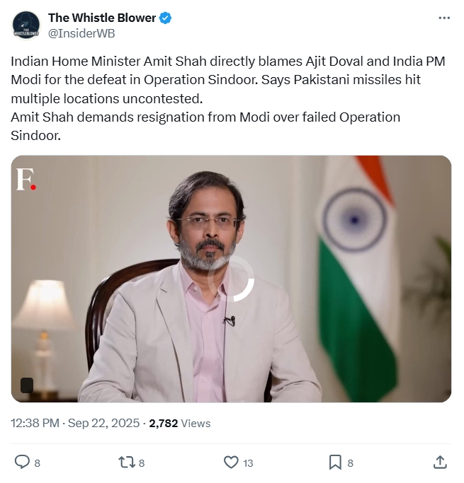 केंद्रीय गृह मंत्री अमित शाह का नेटवर्क18 समूह के प्रधान संपादक राहुल जोशी के साथ एक इंटरव्यू का क्लिप वायरल है जिसमें शाह ने सरकार द्वारा ऑपरेशन सिन्दूर शुरू करने के बाद हालिया संघर्ष के दौरान पाकिस्तान द्वारा भारत में स्थानों को सफलतापूर्वक निशाना बनाए जाने को लेकर प्रधानमंत्री नरेंद्र मोदी की आलोचना करते हुए विवादास्पद बयान दिया हैं. साक्षात्कार में, शाह ने संकट के लिए पीएम मोदी और राष्ट्रीय सुरक्षा सलाहकार अजीत डोभाल की आलोचना की और कहा कि अब समय आ गया है कि नरेंद्र मोदी प्रधानमंत्री पद से इस्तीफा दें और नेतृत्व की कमान किसी और को सौंप दें.