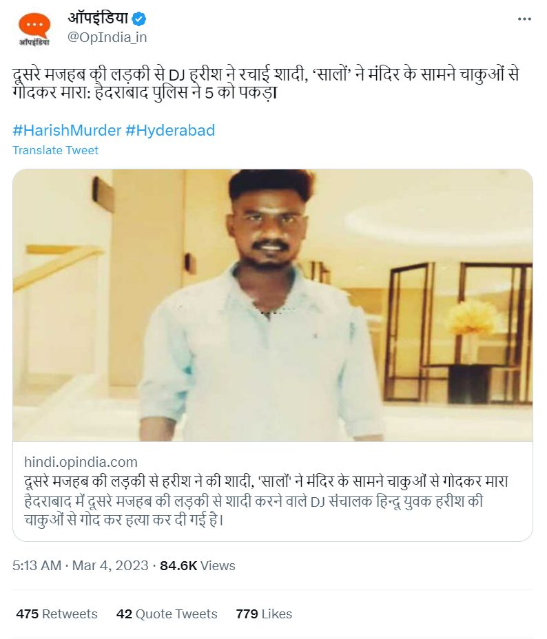 राइट विंग प्रॉपगेंडा वेबसाइट ऑपइंडिया ने आर्टिकल पब्लिश करते हुए दावा किया कि तेलंगाना की राजधानी हैदराबाद में हरीश नाम के युवक ने मुस्लिम लड़की मनीषा से शादी की थी. लड़की के भाइयों ने हरीश की हत्या कर दी. (आर्काइव लिंक)