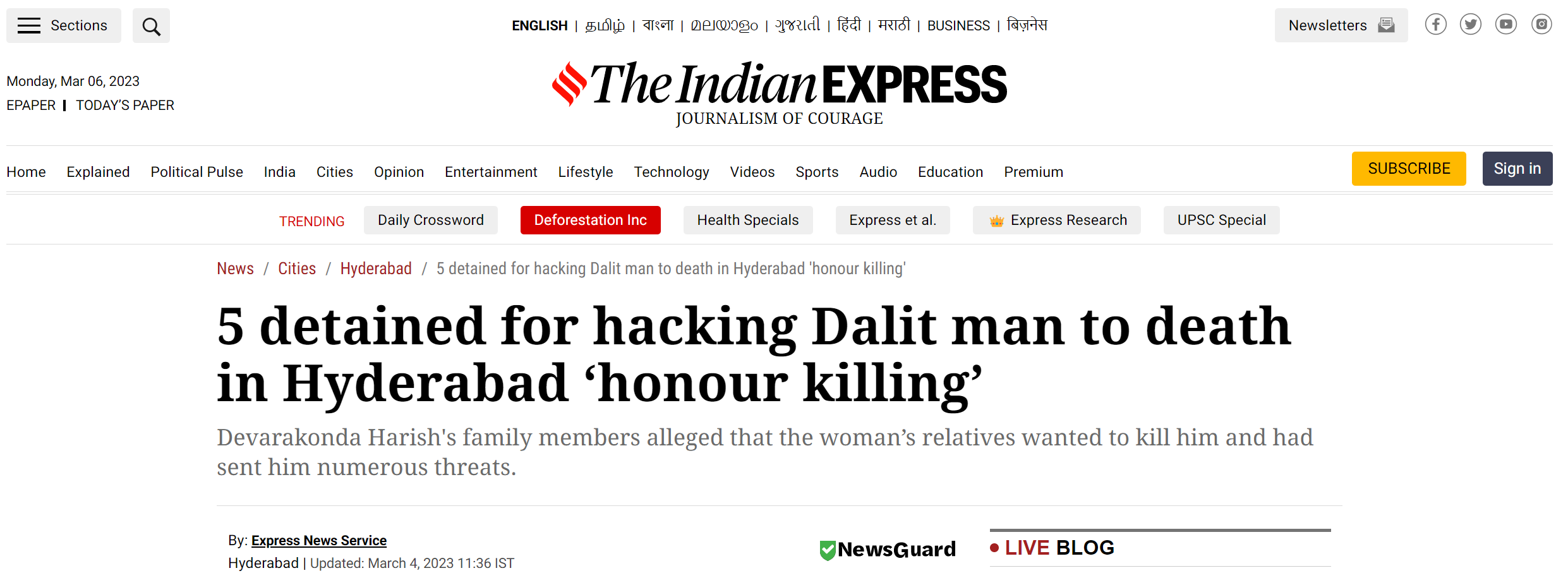 ऑल्ट न्यूज़ ने इस मामले से जुड़े की-वर्ड्स गूगल पर सर्च किये. हमें 4 मार्च की द इंडियन एक्स्प्रेस की रिपोर्ट मिली जिसमें हैदराबाद के पेटबशीराबाद एरिया में हरीश नाम के युवक की हत्या की खबर दी गई है. वहीं बताया गया है कि इस मामले में 5 लोगों को गिरफ्तार किया गया है. पुलिस के मुताबिक, 28 वर्षीय मृतक देवराकोंडा हरीश, 25 वर्षीय मनीषा नाम की लड़की से प्यार करता था. लड़की के परिवार वालों ने हरीश को उनके अफेयर के खिलाफ चेतावनी दी थी और हरीश को मनीषा से दूर रहने के लिए कहा था. 22 फरवरी को हरीश, मनीषा के साथ भाग गया था. इसके बाद उन दोनों ने कथित तौर पर पेटबशीराबाद में एक किराए का अपार्टमेंट लिया था. इसके बाद लड़की के भाई और बाकियों ने मिलकर हरीश को ढूंढा और उसकी हत्या कर दी. पुलिस ने बताया कि इस घटना में मनीषा का भाई मुख्य आरोपी है और उन्होंने वारदात में इस्तेमाल किया गया चाकू बरामद कर लिया है. इस रिपोर्ट में पुलिस के हवाले से ये भी बताया गया है कि पीड़ित और आरोपी, दोनों एक ही समुदाय के हैं.