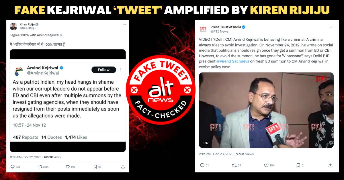 किरेन रिजिजू ने ED-CBI समन पर अरविन्द केजरीवाल का फ़र्ज़ी ट्वीट शेयर किया