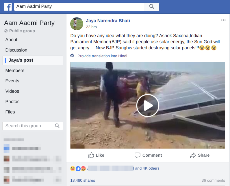 जैसा कि ऊपर दिए गए स्क्रीनशॉट में देखा जा सकता है, इस पोस्ट का दावा है कि भाजपा के सांसद अशोक सक्सेना ने कहा है कि अगर लोग सौर ऊर्जा का उपयोग करते हैं, तो सूर्य देव को गुस्सा आएगा, जिसके परिणामस्वरूप भाजपा कार्यकर्ताओं ने सौर पैनलों को तोड़ना शुरू कर दिया। उपरोक्त पोस्ट आम आदमी पार्टी के आधिकारिक फेसबुक ग्रुप, जिसके 2,00,000 से अधिक सदस्य हैं, में 28 मार्च को पोस्ट की गई है और यह लिखे जाने तक इसे 18,000 से अधिक बार शेयर किया गया है।