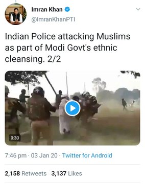 इमरान खान ने एक और वीडियो कुछ इसी तरह के दावे से ट्वीट किया और इसे भी कुछ देर बाद डिलीट कर दिया। उन्होंने लिखा, “मोदी सरकार के जातीय सफाए के तहत भारतीय पुलिस मुसलमानों पर हमला करते हुए।” -(अनुवाद)