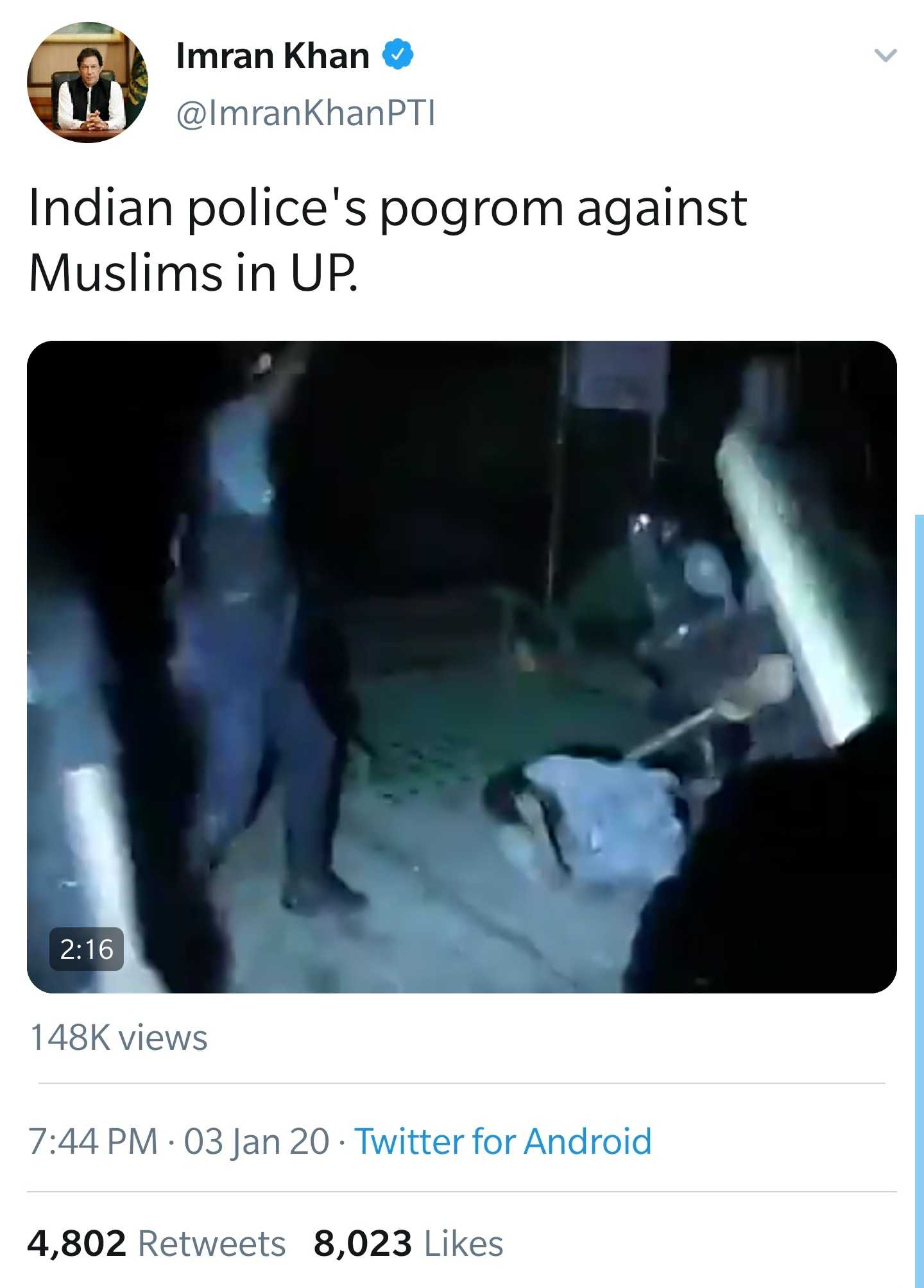 इस तरह पाक पीएम इमरान खान ने बांग्लादेश का पुराना वीडियो और उन्नाव में किसान-पुलिस के बीच झड़प का वीडियो, भारत में ‘मोदी सरकार के जातीय सफाए के तहत भारतीय पुलिस द्वारा मुसलमानों पर हमला’ के झूठे दावे से ट्वीट किया था।