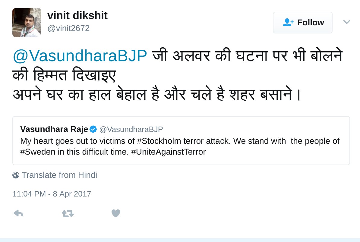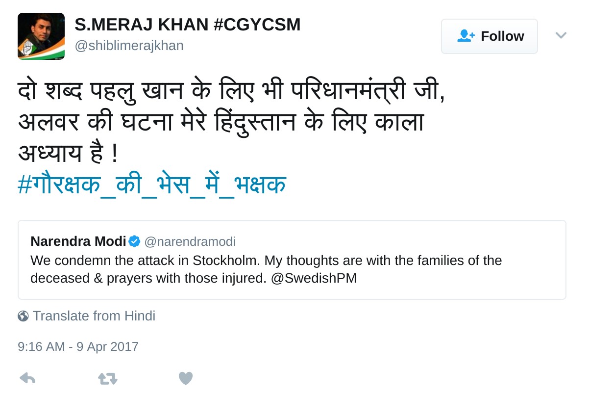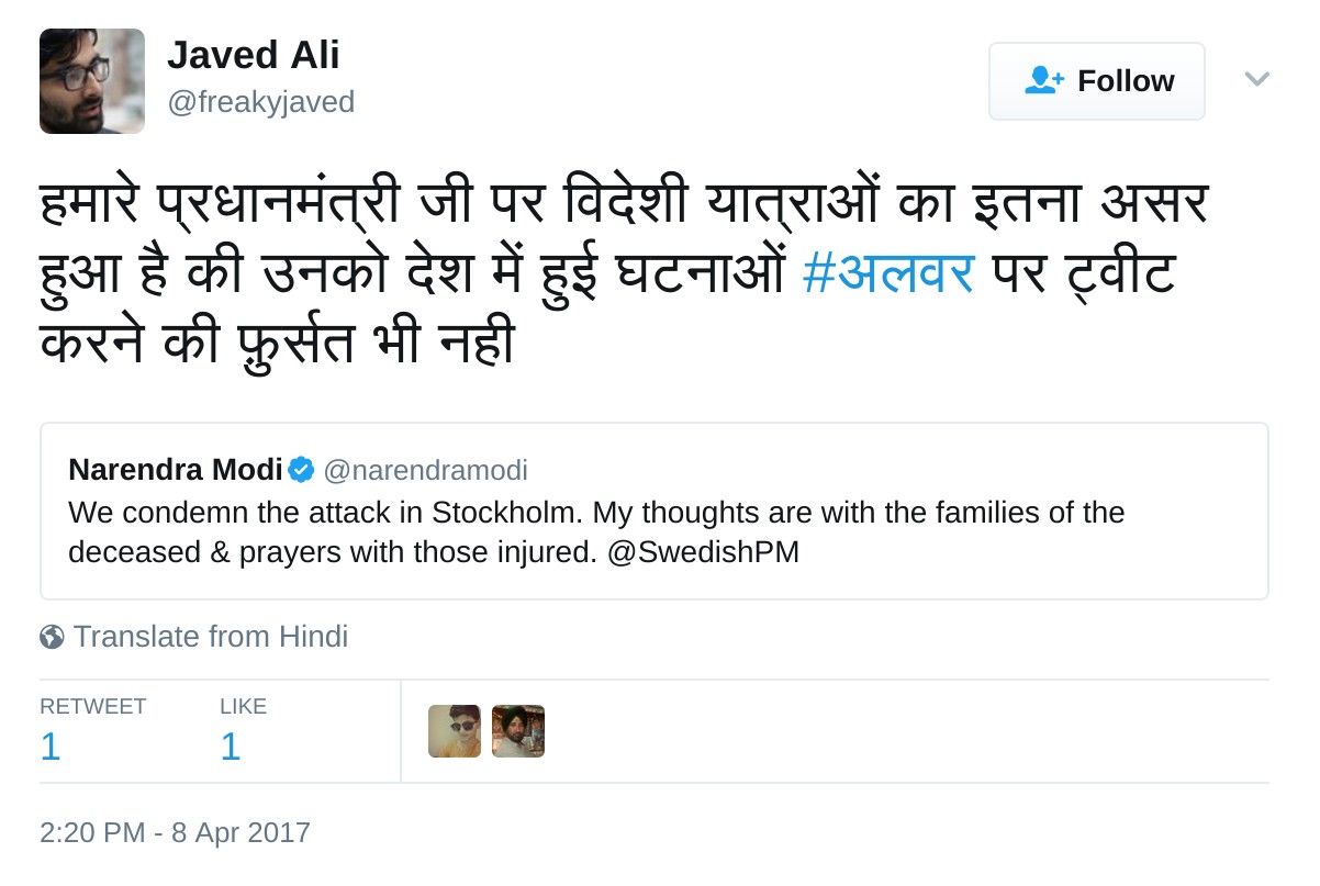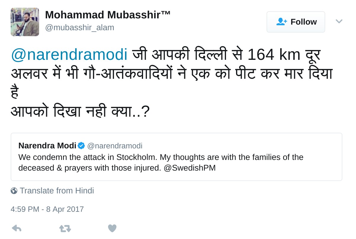 ऐसे में जब बीजेपी के सारे नेता गौरक्षकों द्वारा दिन-दहाड़े की गयी इस हत्या को दबाने की कोशिशों में लगे थे, तभी प्रधानमंत्री नरेन्द्र मोदी और राजस्थान की मुख्यमंत्री वसुंधरा राजे को स्वीडन के स्टॉकहोम में हुए एक कथित आतंकी हमले की निंदा करते हुए ट्वीट करने की सूझी और वो भी तब जब उन्होंने अलवर में हुई हत्या पर एक भी शब्द ना बोला हो। सोशल मीडिया पर बहुत लोगों को नरेन्द्र मोदी और बसुन्धरा राजे का यह दोगला आचरण रास नहीं आया और इन दोनों का इस पर खूब खरी-खोटी सुनाई।