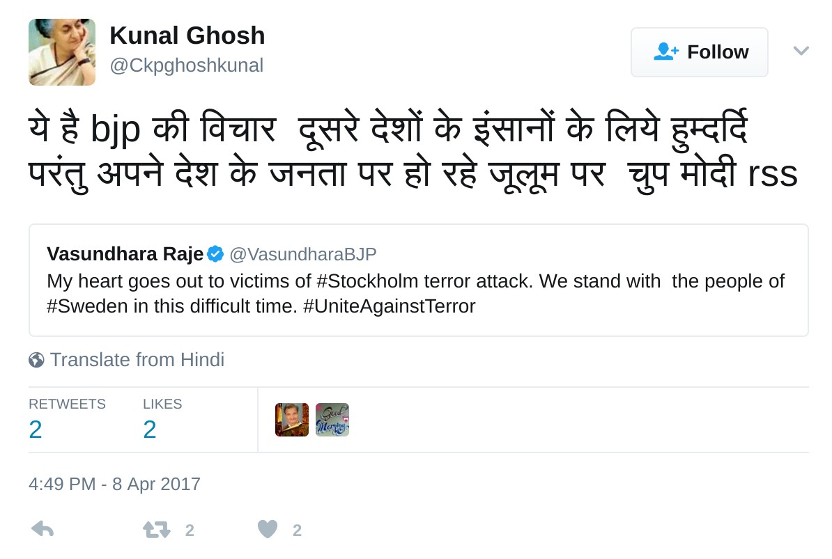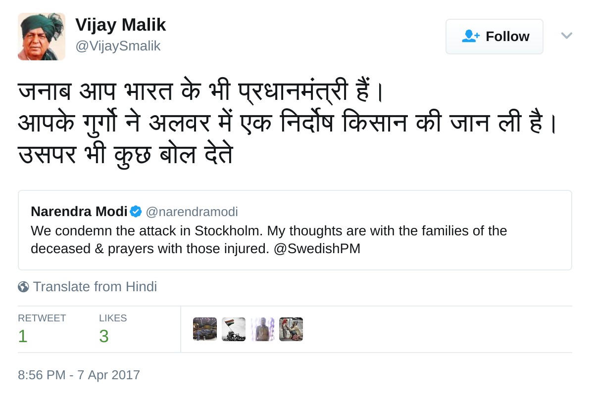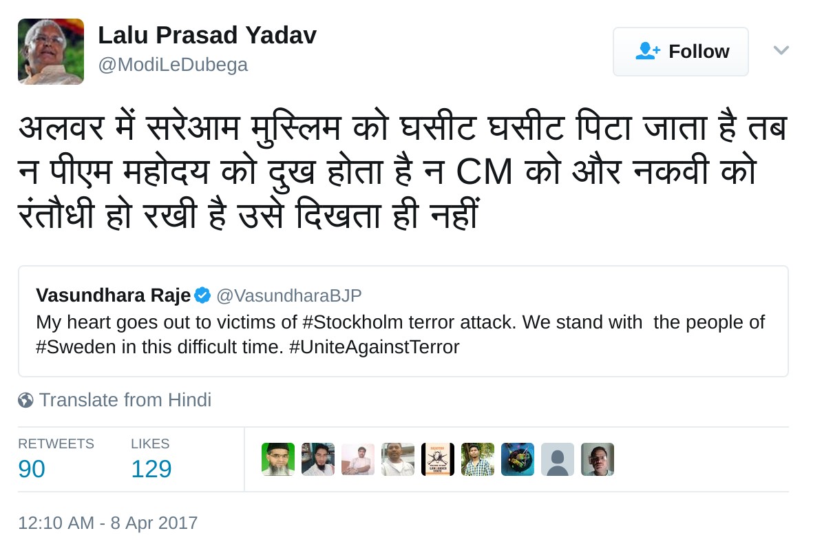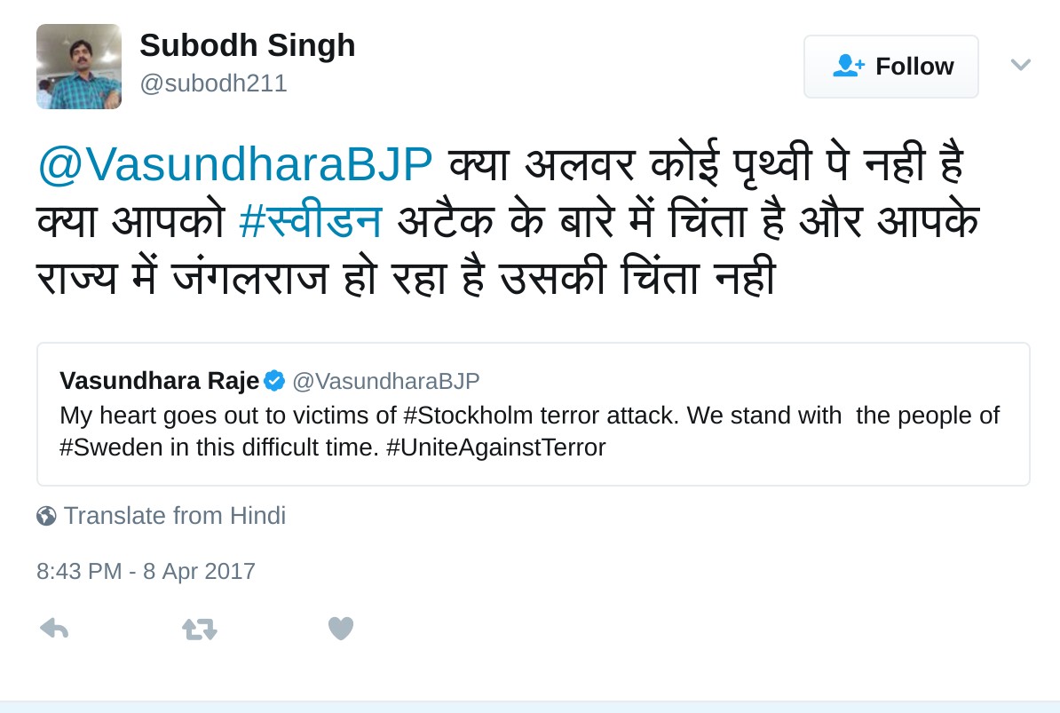 ऐसे में जब बीजेपी के सारे नेता गौरक्षकों द्वारा दिन-दहाड़े की गयी इस हत्या को दबाने की कोशिशों में लगे थे, तभी प्रधानमंत्री नरेन्द्र मोदी और राजस्थान की मुख्यमंत्री वसुंधरा राजे को स्वीडन के स्टॉकहोम में हुए एक कथित आतंकी हमले की निंदा करते हुए ट्वीट करने की सूझी और वो भी तब जब उन्होंने अलवर में हुई हत्या पर एक भी शब्द ना बोला हो। सोशल मीडिया पर बहुत लोगों को नरेन्द्र मोदी और बसुन्धरा राजे का यह दोगला आचरण रास नहीं आया और इन दोनों का इस पर खूब खरी-खोटी सुनाई।