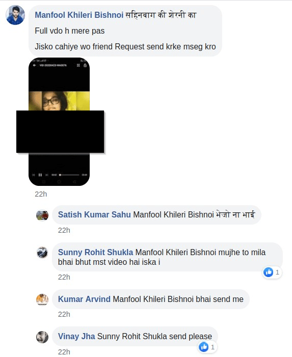 एक फ़ेसबुक ग्रुप के कई सदस्य एक पोर्नोग्राफ़िक वीडियो शेयर करते हुए दावा कर रहे हैं कि वीडियो में दिख रही महिला सफ़ूरा ज़रगर हैं. इस ग्रुप के कई सदस्य ये कहते हुए दिखे कि उन्हें फ्रेंड रिक्वेस्ट भेजने पर वो ये वीडियो भेज देंगे. इसके कमेंट्स में इस वीडियो की चाहत में लोगों ने अपने फ़ोन नंबर भी शेयर किए हैं. कईयों ने ‘भाई भेज ये वीडियो’ और ‘मुझे ये वीडियो चाहिए’ जैसे कमेंट्स किए हैं. कमेंट्स हताश करने वाले हैं.