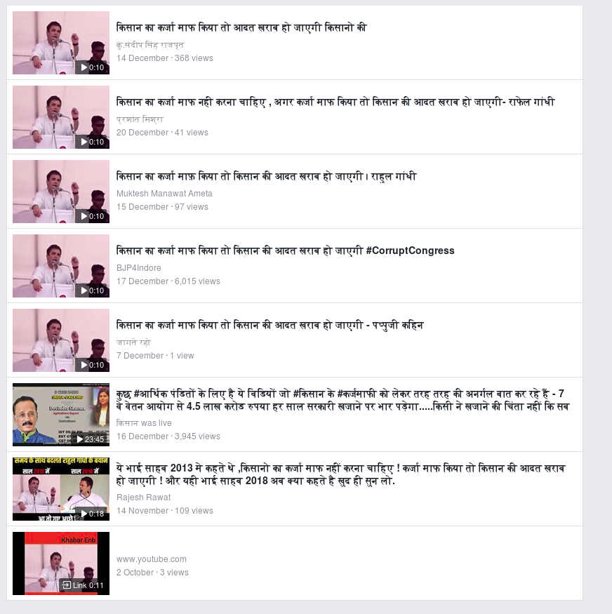 एक ट्विटर यूजर @Lala_The_Don ने 18 जून, 2018 को यह क्लिप ट्वीट कर दावा किया था, “किसान और किसान कर्ज माफी के बारे में राहुल बाबा ऐसा सोचते हैं – (अनुवादित)”। यह उन शुरुआती उदाहरणों में से एक था, जिसे ऑल्ट न्यूज़ खोज पाया। लगभग उसी समय फेसबुक पेज राग दरबारी द्वारा शेयर की गई उस क्लिप को 22,000 से अधिक बार शेयर और 5,00,000 से अधिक बार देखा गया है। भाजपा नेता आत्माराम पटेल ने भी यह सुझाव देते हुए कि राहुल गांधी ने ऐसा बयान दिया है, राग दरबारी के इस क्लिप को शेयर किया।