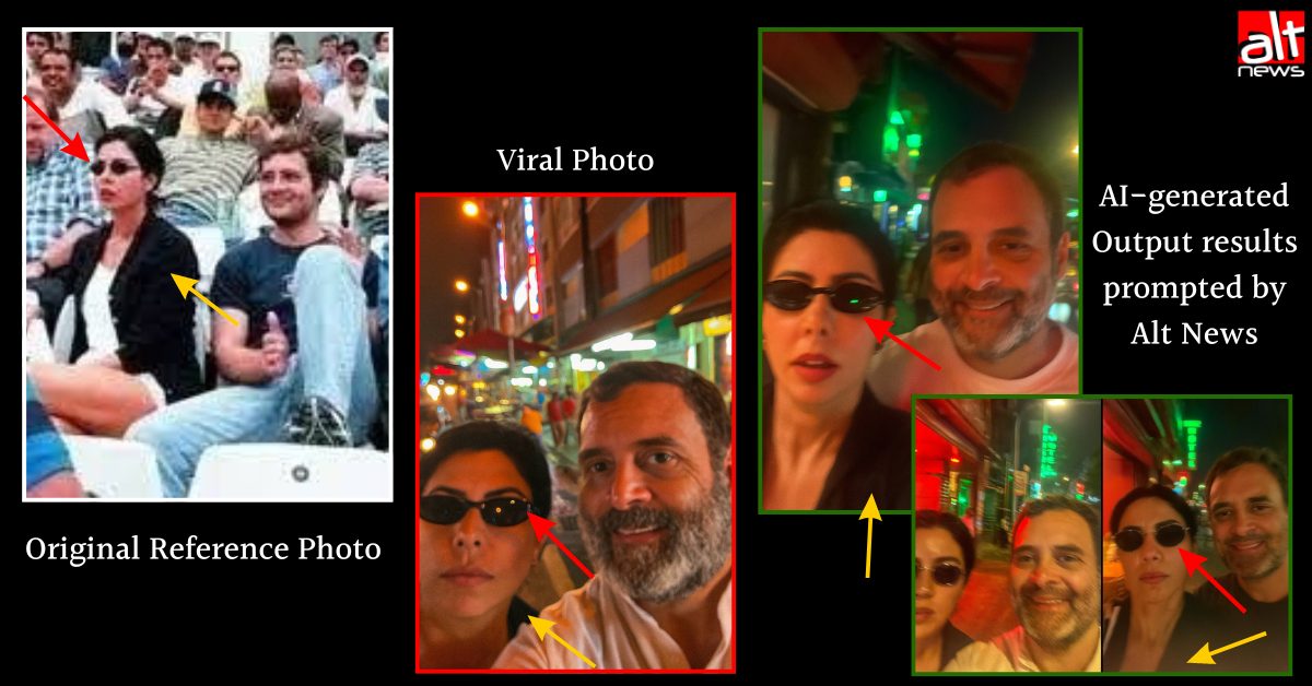 कुल मिलाकर, डार्क सनग्लासेस पहने एक महिला (जिसे कुछ लोग वेरोनिक कार्टेली के रूप में पहचानते हैं) के साथ राहुल गांधी की वायरल सेल्फ़ी असली नहीं है और संभवतः AI-जनरेटेड है.
