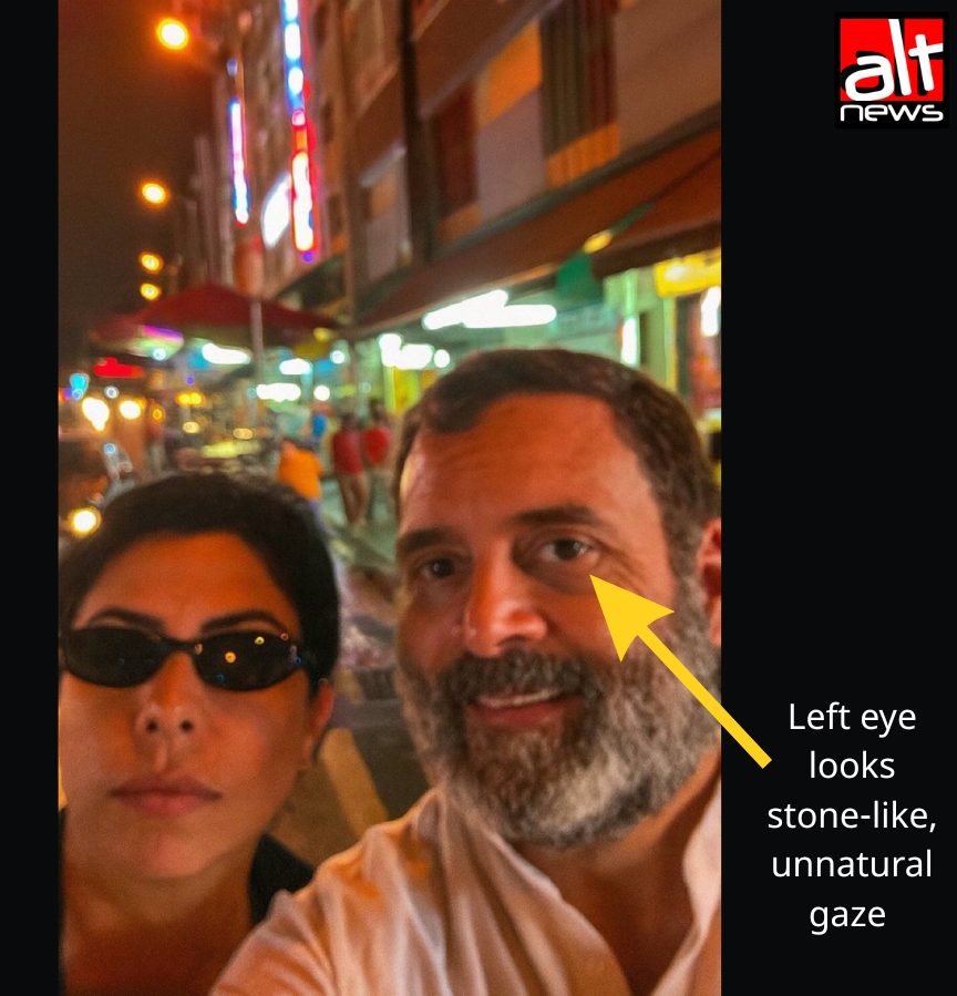 तस्वीर की बारीकी से जांच करने पर पता चलता है कि राहुल गांधी की बायीं आंख अजीब तरह से कठोर और पत्थर जैसी दिखती है, जिसमें अप्राकृतिक टकटकी विक्षेपण है, जो कि ज़्यादातर AI-जनरेटेड तस्वीरों में पाई जाने वाली एक सामान्य विसंगति है.