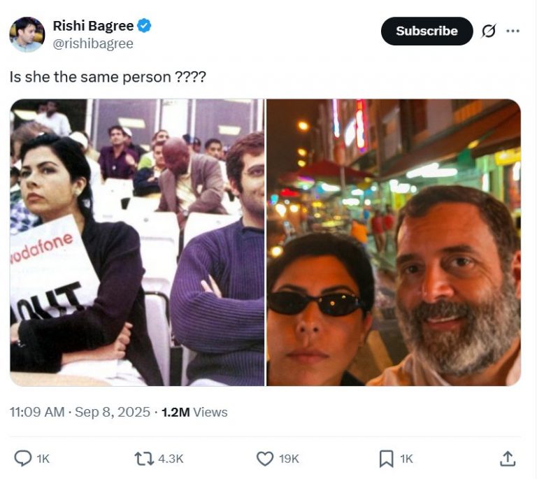 भाजपा समर्थक इन्फ्लुएंसर ऋषि बागरी ने ‘सेल्फ़ी’ और महिला के साथ राहुल गांधी की पुरानी तस्वीर शेयर करते हुए पूछा कि क्या ये वही है. पोस्ट को 4 हज़ार से ज़्यादा बार रिशेयर किया गया और ये 1.2 मिलियन यूज़र्स तक पहुंचा .