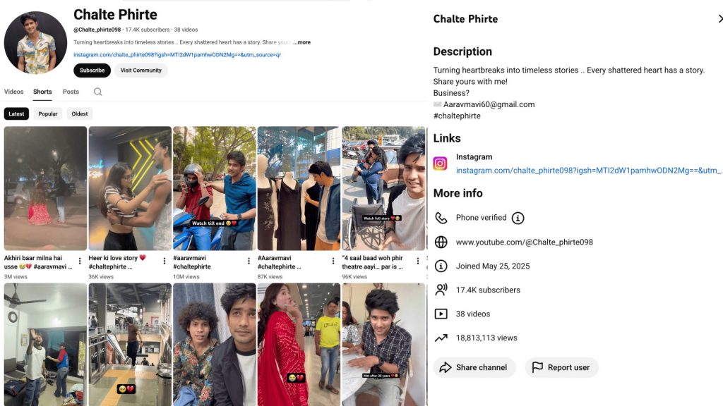 कंटेंट क्रिएटर आरव मावी के इंस्टग्राम पेज और यूट्यूब चैनल को खंगालने पर हमें इन पर रिलेशनशिप में धोखा और लव ऐंगल वाले कई स्क्रिप्टेड वीडियो अपलोडेड मिले. इसके अलावा कंटेंट क्रिएटर ने अपने यूट्यूब चैनल के डिस्क्लेमर में लिखा है, “दिल टूटने के दर्द को अमर कहानियों में बदलना.” और ये यूज़र लोगों से अपनी स्टोरी उसके साथ शेयर करने का भी आग्रह करता है.