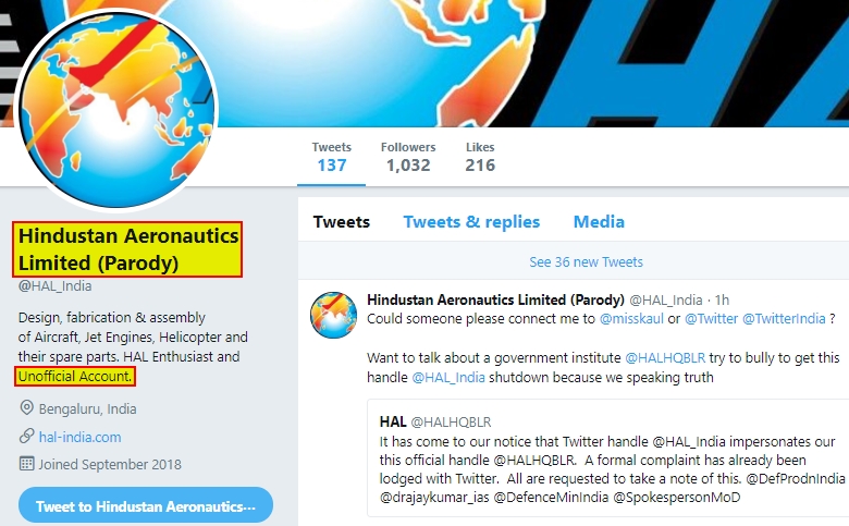 इसके अलावा, एचएएल ने ट्वीट किया है कि अकाउंट HAL_India, हमारे आधिकारिक हैंडल का प्रतिरूपण करता है और इसके बारे में ट्विटर को औपचारिक शिकायत दर्ज कराई गई है। इस ट्वीट पर Hal_India ने जवाब देकर स्पष्ट किया कि यह एचएएल का आधिकारिक अकाउंट नहीं है।