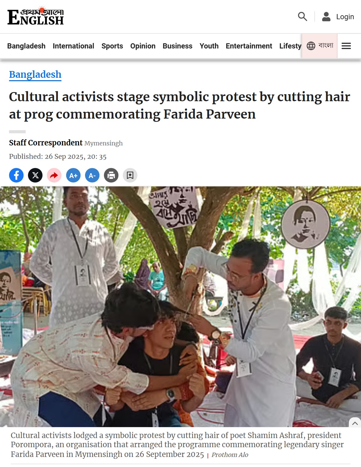 वायरल वीडियो के की-फ्रेम्स को गूगल पर रिवर्स इमेज सर्च करने पर हमें बांग्लादेशी न्यूज़ वेबसाइट Prothom Alo पर 26 सितंबर 2025 को प्रकाशित एक खबर मिली. इस ख़बर की फीचर्ड इमेज वायरल वीडियो से मेल खाती है. ख़बर के मुताबिक, फरीदा परवीन की याद में आयोजित कार्यक्रम में सांस्कृतिक कार्यकर्ताओं ने बाल काटकर प्रतीकात्मक विरोध प्रदर्शन किया था. आगे लिखा है कि बांग्लादेश के मैमनसिंह में कल्चरल एक्टिविस्ट्स ने कई लोगों के बाल जबरदस्ती काटे जाने के खिलाफ़ मशहूर कलाकार फरीदा परवीन की याद में एक कार्यक्रम में सांकेतिक प्रदर्शन करके विरोध किया. ब्रह्मपुत्र नदी के किनारे शिल्पाचार्य ज़ैनुल उद्यान में हुआ यह प्रदर्शन सोशल मीडिया पर वायरल हुए एक वीडियो के जवाब में थी, जिसमें ताराकांडा के हलीम उद्दीन अकंद के बाल कई लोगों ने जबरदस्ती काट दिए थे. अकंद को स्थानीय रूप से हलीम फकीर के नाम से जाना जाता है. कार्यक्रम की शुरुआत में, आयोजक और कवि शमीम अशरफ के बाल काटे गए.