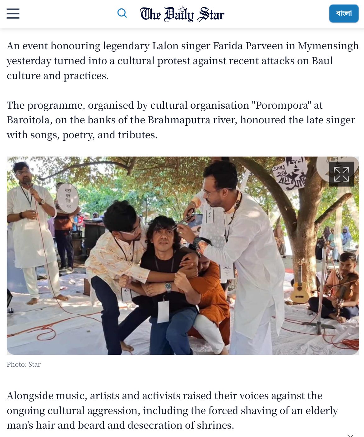 हमें बांग्लादेश के न्यूज़ वेबसाइट The Daily Star पर भी इससे जुड़ी एक खबर 27 सितंबर को प्रकाशित मिली. रिपोर्ट के मुताबिक, मैमनसिंह में मशहूर लालन गायिका फरीदा परवीन को सम्मानित करने वाला एक कार्यक्रम, बाउल संस्कृति और रीति-रिवाजों पर हाल के हमलों के खिलाफ एक सांस्कृतिक विरोध प्रदर्शन में बदल गया. ब्रह्मपुत्र नदी के किनारे बरोइटोला में सांस्कृतिक संगठन “पोरम्पोरा” द्वारा आयोजित इस कार्यक्रम में दिवंगत गायिका को गाने, कविता और श्रद्धांजलि देकर सम्मानित किया गया.