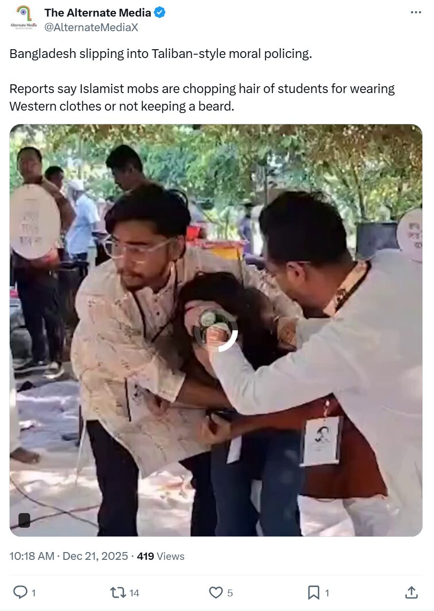 द आल्टर्नेट मीडिया नाम के अकाउंट ने वीडियो शेयर करते हुए लिखा कि बांग्लादेश तालिबान-स्टाइल मोरल पुलिसिंग की तरफ बढ़ रहा है. इसके साथ ही वीडियो के बारे में दावा किया कि इस्लामी भीड़ पश्चिमी कपड़े पहनने या दाढ़ी न रखने पर छात्रों के बाल काट रही है. (आर्काइव लिंक)