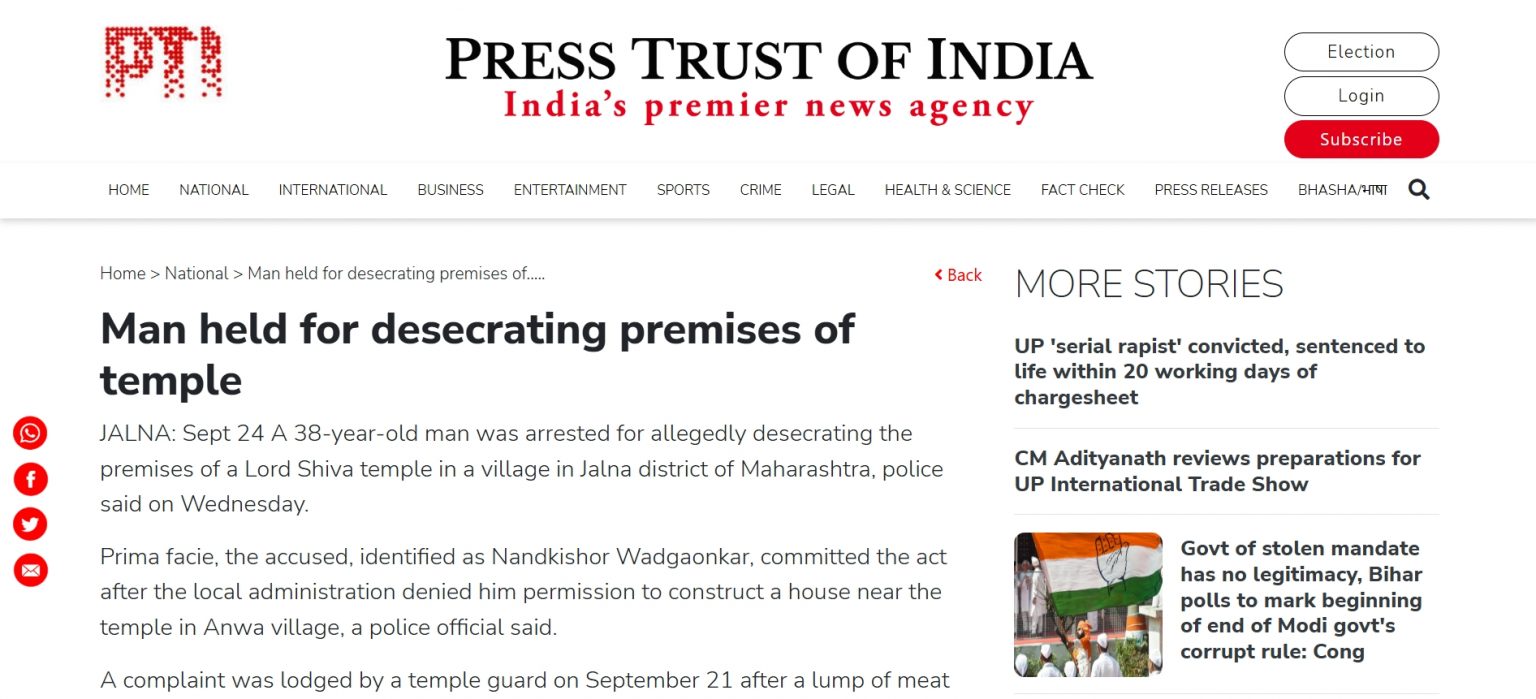 ऑल्ट न्यूज़ ने महाराष्ट्र के अनवा गांव में आखिरकार क्या हुआ था? ये समझने के लिए गूगल पर सर्च किया. हमें न्यूज़ एजेंसी PTI की 24 सितंबर, 2025 की एक रिपोर्ट मिली. आर्टिकल के मुताबिक, आरोपी की पहचान नंदकिशोर वडगांवकर के रूप में हुई. कथित तौर पर स्थानीय अधिकारियों द्वारा शिव मंदिर के पास घर बनाने की अनुमति नहीं दिए जाने के बाद उसने ये काम किया.