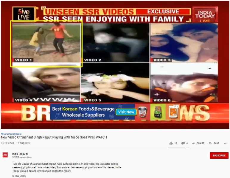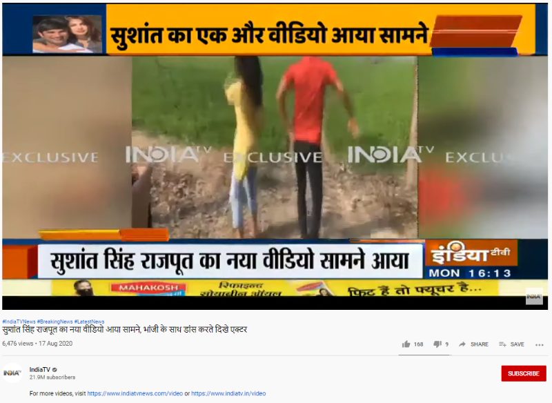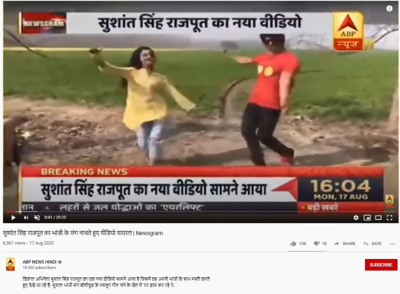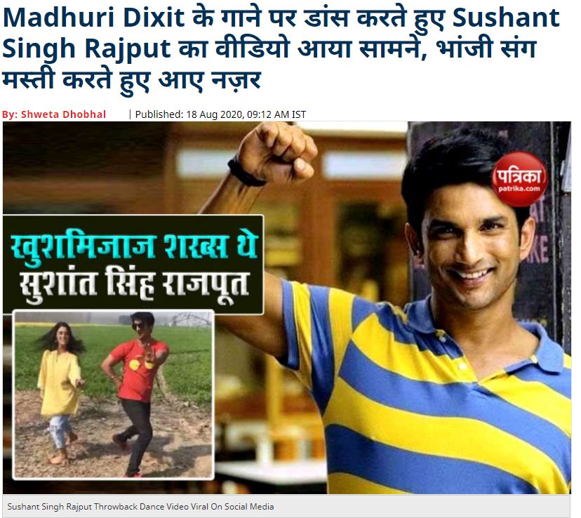 देखते ही देखते ये वीडियो मीडिया आउटलेट्स की एक प्रमुख खबर बन गया. आज तक, ABP न्यूज़, हिंदुस्तान, पत्रिका, टाइम्स ऑफ़ इंडिया, टाइम्स नाउ, इंडिया टीवी, न्यूज़ नेशन, ABP इंग्लिश, इंडिया टुडे इनमें से प्रमुख नाम हैं. आज तक ने लिखा है, “सुशांत सिंह राजपूत का एक और वीडियो सामने आया है. इस वीडियो में सुशांत अपनी भांजी मल्लिका से साथ मस्ती कर रहे हैं. मामा-भांजी की जोड़ी साथ में डांस का मजा भी ले रही है. इन वीडियो को देखकर साफ समझा जा सकता है कि परिवार के साथ सुशांत के कैसे रिश्ते थे. क्योकि रिया लगातार सुशांत के परिवार के साथ संबंध खराब होने की बात कह रही हैं.”