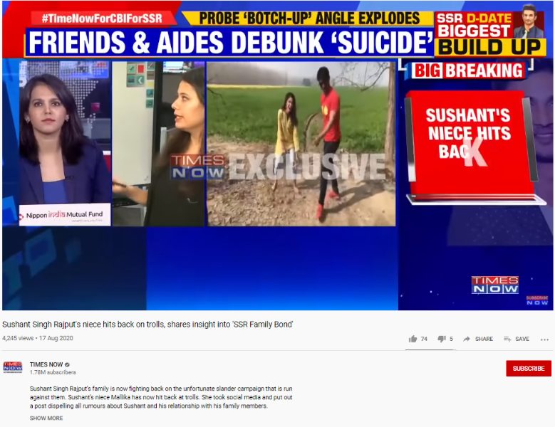 सुशांत सिंह राजपूत की मौत को 2 महीने से अधिक हो गए लेकिन मीडिया की रुचि इस मामले में दिन-ब-दिन बढ़ती ही जा रही है. सुशांत के पिता ने ऐक्टर रिया पर सुशांत की मौत का आरोप लगाते हुए FIR लिखवाई. इसके बाद सुशांत की पार्टनर रिया चक्रवर्ती ने कथित तौर पर कहा कि सुशांत और उनके परिवार के बीच रिश्ते अच्छे नहीं थे और वो डिप्रेशन में थे. इसके बाद से परिवारवालों ने सुशांत के साथ कई वीडियो जारी करते हुए पोस्ट लिखा कि सुशांत अपनी पूरी फ़ैमिली से काफ़ी नज़दीक थे. कई मीडियाकर्मियों ने ऐसे वीडियोज़ ट्वीट किये. ये वीडियोज़ प्राइम टाइम का हिस्सा भी बने. आज तक की एग्ज़ेक्यूटिव एडिटर अंजना ओम कश्यप ने 17 अगस्त को एक वीडियो ट्वीट करते हुए लिखा, “मामू-भांजी की मस्ती। परिवार का प्यार! सुशांत की सबसे बड़ी बहन रानी की बेटी मल्लिका सिंह के साथ नाचते गाते.”