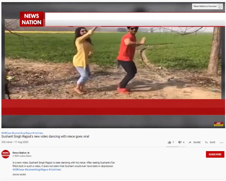 न्यूज़ नेशन ने लिखा है, “एक नए वीडियो में सुशांत अपनी भांजी के साथ डांस करते नजर आ रहे हैं. इस तरह के वीडियो में सुशांत की मस्ती भरे अंदाज देखने के बाद ऐसा नहीं लगता कि सुशांत कभी डिप्रेशन में रहे होंगे.”
