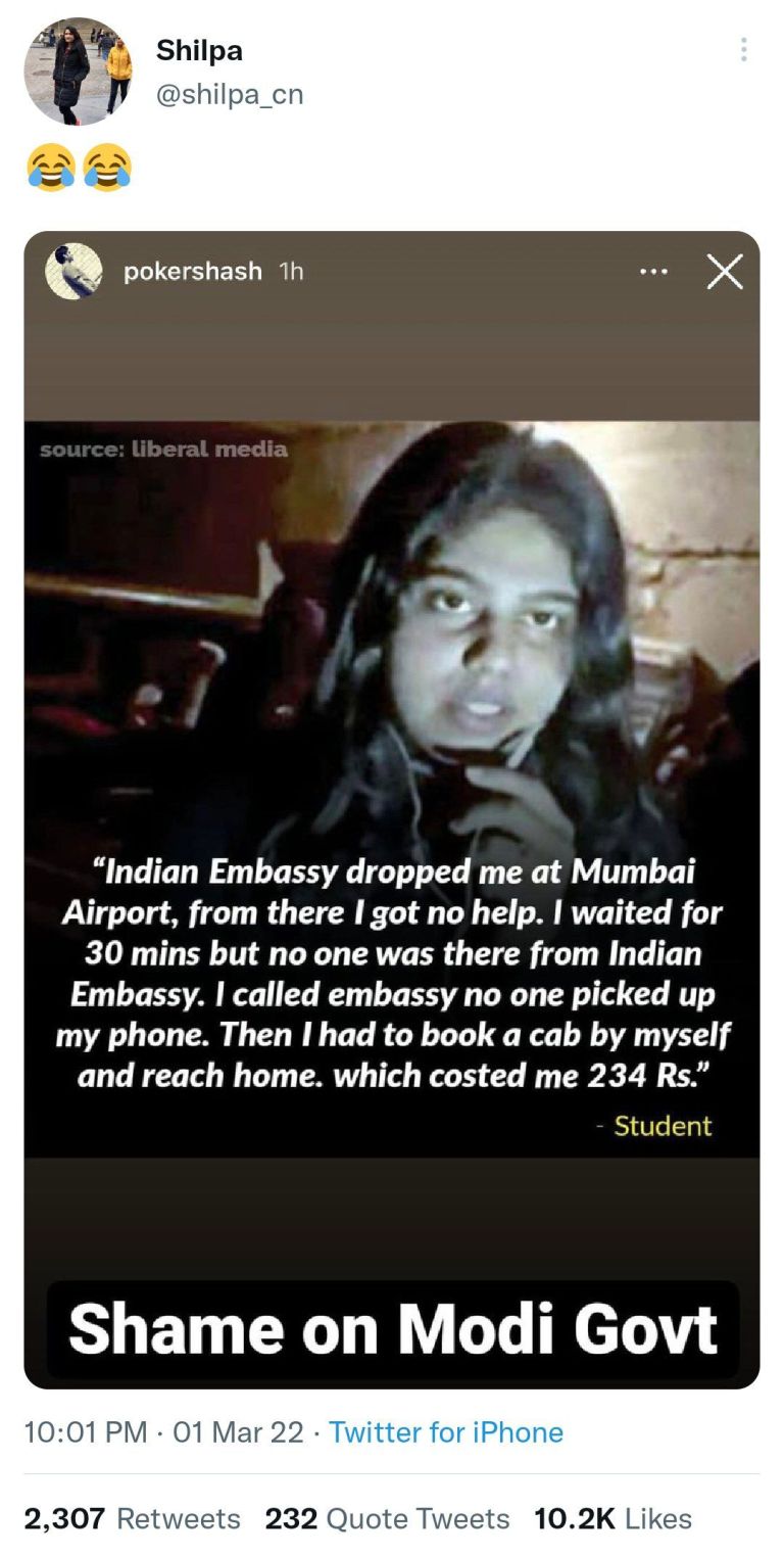 2 मार्च से सोशल मीडिया पर एक लड़की की तस्वीर शेयर की जा रही है. इस लड़की ने यूक्रेन से वीडियो बनाकर भारत सरकार से मदद मांगी थी. तस्वीर के साथ एक बयान भी शेयर किया जा रहा है. छात्रा के हवाले से दिए गए इस बयान में स्टूडेंट्स की स्थिति का मज़ाक उड़ाने की कोशिश की गई है. छात्रा के हवाले से लिखा है: “भारतीय दूतावास ने मुझे मुंबई एयरपोर्ट पर उतारा, जहां से मुझे कोई मदद नहीं मिली. मैंने 30 मिनट तक इंतजार किया लेकिन भारतीय दूतावास से कोई नहीं आया. मैंने दूतावास को फ़ोन किया, किसी ने मेरा फ़ोन नहीं उठाया. फिर मुझे खुद कैब बुक कर घर पहुंचना पड़ा. जिसमें मुझे 234 रुपये देने पड़े.”