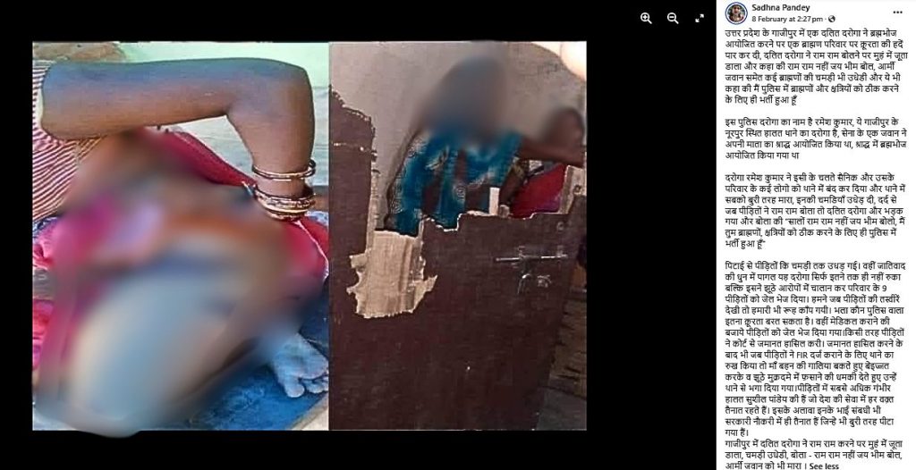 इन दिनों सोशल मीडिया पर एक महिला की तस्वीर वायरल है जिसमें उसका पैर ज़ख़्मी दिख रहा है. यूज़र्स इसे शेयर कर दावा कर रहे हैं कि उत्तर प्रदेश के गाजीपुर में एक दलित दरोगा ने ब्रह्मभोज आयोजित करने पर एक ब्राह्मण परिवार पर क्रूरता की हदें पार कर दी. मेसेज में कथित रूप से कहा गया कि दलित दरोगा ने राम राम बोलने पर मुहं में जूता डाला और कहा की राम राम नहीं जय भीम बोल. वहीं साथ में ये बताया गया कि दरोगा का नाम रमेश कुमार है और उसकी पोस्टिंग गाजीपुर के नूरपुर स्थित हालत थाने में है. वायरल टेक्स्ट में कई ऐसे आरोप लगाए गए हैं और दरोगा द्वारा ब्राह्मण परिवार पर अत्याचार के दावे किये गए हैं.