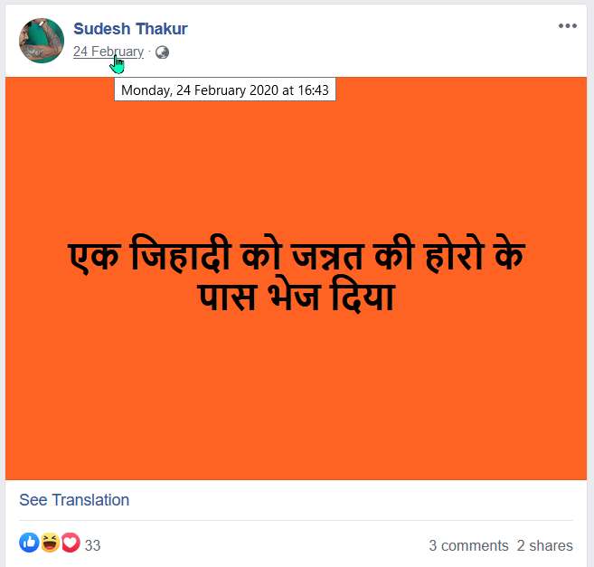 सुदेश ठाकुर ने फ़ेसबुक लाइव के दौरान कबूला, “एक मुल्ले को आज़ादी दी.” उनके आस-पास दर्जनों लोगों की भीड़ थी और वहां जश्न का माहौल था – लोग ‘हर हर महादेव’ की आवाज़ पर नाचते देखे जा सकते हैं. ये वीडियो ठाकुर ने कुछ ही वक़्त में डिलीट कर दिया. हमारे रिकॉर्ड के अनुसार यह 24 फ़रवरी को शाम 5 से 6 बजे के बीच पोस्ट किया गया था.