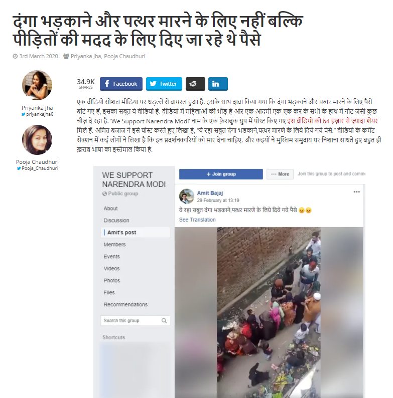 सुदेश ने कहा, “इस प्रोटेस्ट के ज़रिये, इस प्रोटेस्ट की आड़ में इतने गलत धंधे हो रहे थे, इतने सारे गलत काम.” जब उन्हें बताया गया कि इन बातों का कोई सबूत नहीं है तो उन्होंने कहा, “सर वहां जिस्मफरोशी का धंधा हो रहा था. उसके वीडियोज़ आप फ़ेसबुक पे ही देखें, कितने हो रहे थे.” दिल्ली दंगों से पहले ऑल्ट न्यूज़ ने महिला प्रदर्शनकारियों के ख़िलाफ़ झूठी खबरों और अफ़वाहों की सच्चाई को उजागर किया था. इनमें से कुछ झूठे दावों के अनुसार मुस्लिम महिलाएं नशे का सामान बेच रही थीं और देह व्यापार में संलिप्त थीं. ठाकुर ने कहा, “एक वीडियो है सर मेरे पास जिसमें ना, लाइन लगाके जो उस प्रोटेस्ट में जा रहे थे और सीएए दंगों में जो पार्ट ले रहे थे, उसमें एक वीडियो है मेरे पास, जिसमें पैसे बांटे जा रहें हैं मॉमडंस के इलाके में..” इस वीडियो का ऑल्ट न्यूज़ ने 3 मार्च को फै़क्ट चेक किया था.