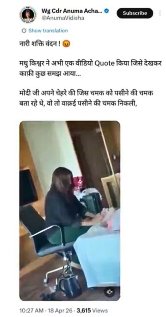 रिटायर्ड विंग कमांडर और कांग्रेस कार्यकर्ता अनुमा आचार्य ने भी वायरल वीडियो को नरेंद्र मोदी का बताते हुए एक्स पर लिखा, “नारी शक्ति वंदन. मधु किश्वर ने अभी एक वीडियो Quote किया जिसे देखकर काफ़ी कुछ समझ आया. मोदी जी अपने चेहरे की जिस चमक को पसीने की चमक बता रहे थे, वो तो वाक़ई पसीने की चमक निकली.”