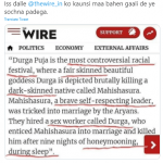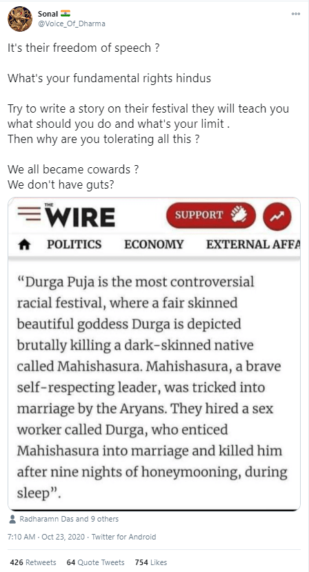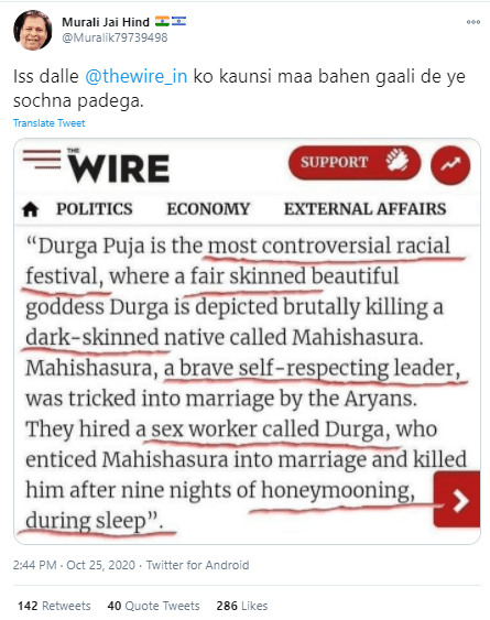 ट्विटर पर ‘द वायर’ के आर्टिकल का एक हिस्सा काफ़ी शेयर किया जा रहा है. दावा किया गया कि इस न्यूज़ प्लेटफ़ॉर्म ने दुर्गा पूजा को ‘नस्लभेदी त्यौहार’ और हिन्दू देवी को ‘सेक्स वर्कर’ कह कर ‘ऐंटी-हिन्दू’ भावनाओं को बढ़ावा दिया है.