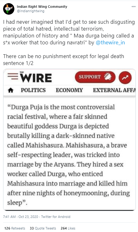 @Voice_Of_Dharma, @Muralik79739498 ने भी ये स्क्रीनशॉट शेयर किया. ट्विटर हैंडल @indianrightwing ने लिखा, “@thewire_in ने माँ दुर्गा को सेक्स वर्कर कहा, वो भी नवरात्र में. कानूनी तौर से सज़ा-ए-मौत के अलावा और कोई सज़ा नहीं हो सकती…”