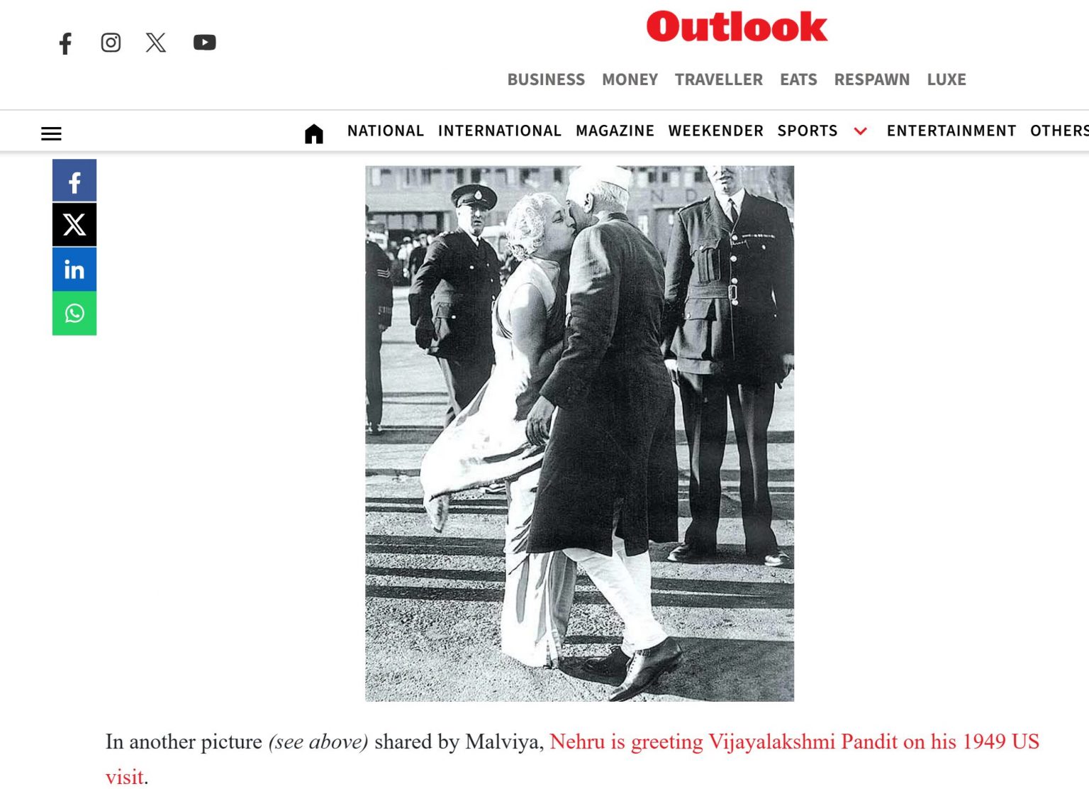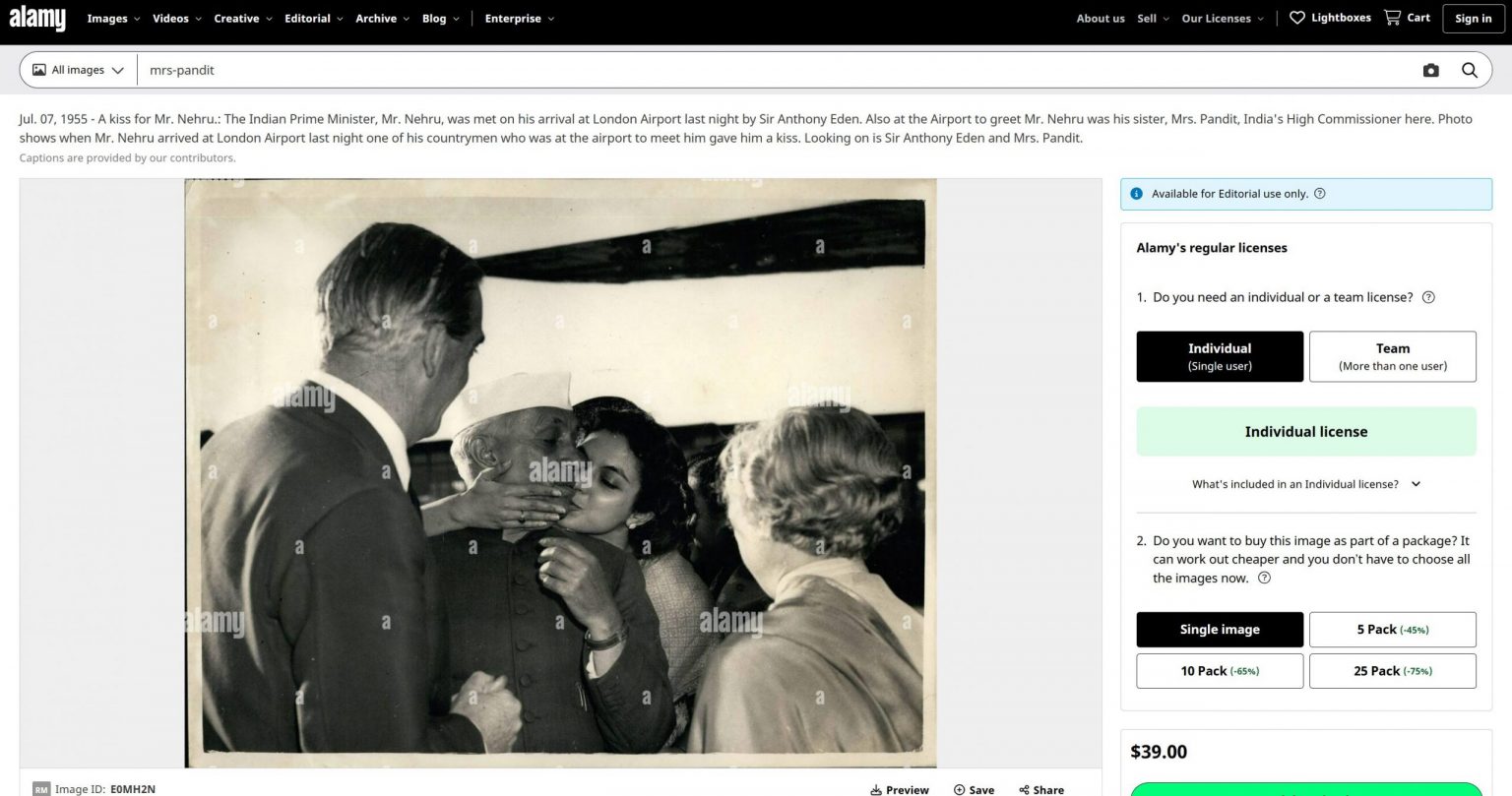 कोलाज पर वापस आते हुए, बाईं ओर की तस्वीर में नेहरू को अपनी बहन विजया लक्ष्मी पंडित को गले लगाते हुए दिखाया गया है. ये तस्वीर पहले भी ग़लत दावे के साथ शेयर हुई थी, 2017 में ऑल्ट न्यूज़ ने इसकी सच्चाई बताई थी और साथ ही 2024 में आउटलुक ने भी इसे रिपोर्ट किया था.
