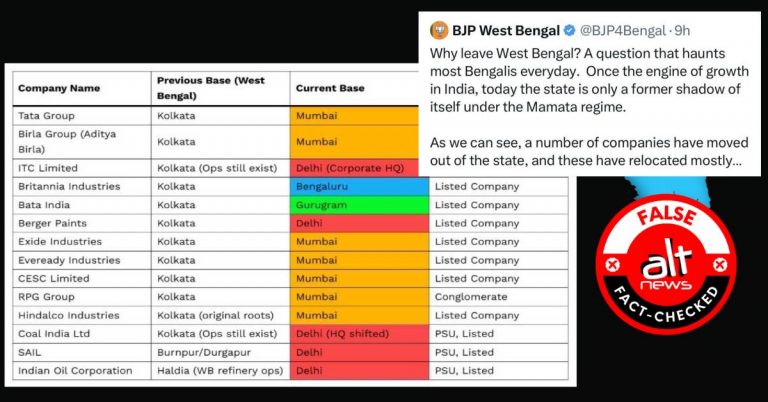 BJP पश्चिम बंगाल ने ममता बनर्जी के शासनकाल में 14 कंपनियों के बंगाल छोड़ने का झूठा दावा किया
