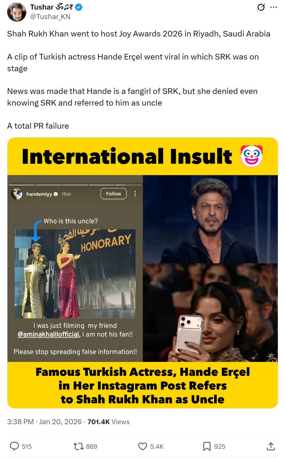 इसके बाद से सोशल मीडिया पर टर्किश एक्ट्रेस के कथित इंस्टाग्राम स्टोरी का स्क्रीनशॉट शेयर किया जाने लगा जिसमें भारतीय एक्टर शाहरुख खान की तस्वीर की ओर निशान बनाकर लिखा है, “ये अंकल कौन हैं? मैं अपनी दोस्त अमीना खान का वीडियो बना रही थी, मैं उनकी फैन नहीं हूँ”.