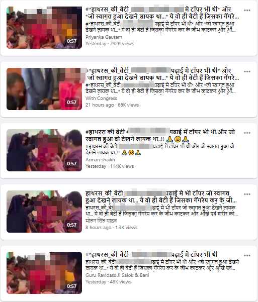 सोशल मीडिया पर एक महिला का वीडियो शेयर किया जा रहा है. इसमें वो लोगों की भीड़ के बीच से गुज़र रही है और लोग उसके सामने झुक रहे हैं, पैर छू रहे हैं और फूल दे रहे हैं. इसके साथ ही दावा किया जा रहा है कि वीडियो में हाथरस की 19 वर्षीय दलित महिला है जिसके साथ पिछले महीने 4 लोगों ने कथित तौर पर गैंगरेप और बर्बरता की थी. बहुजन समाज पार्टी की कार्यकर्ता होने का दावा करने वाली प्रियंका गौतम ने वीडियो शेयर करते हुए लिखा, “हाथरस_की_बेटी_[नाम को ब्लर किया गया है] पढ़ाई मे टॉपर भी थी. ओर जो स्वागत हुआ देखने लायक था.” इस पोस्ट को 15,000 से भी ज़्यादा बार शेयर किया गया.