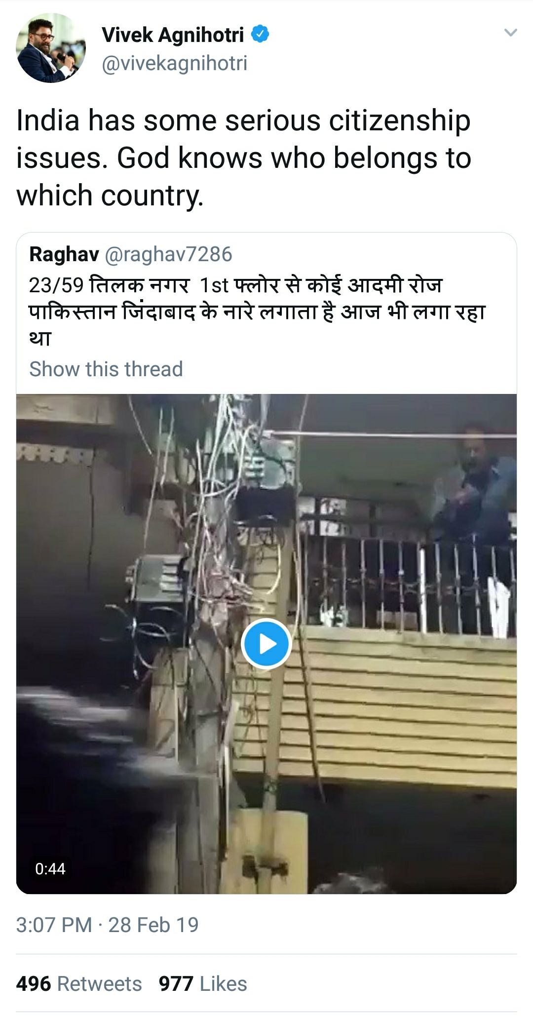 लेखक और फिल्मकार विवेक अग्निहोत्री ने इस वीडियो का कोट-ट्वीट किया, जिसे यूजर @Raghav7286 ने दूसरे संदेश के साथ, यह कहते हुए शेयर किया- “भारत में नागरिकता के कुछ गंभीर मसले हैं। भगवान ही जानता है कि कौन किस देश से है।” यह लिखते समय, यह ट्वीट हटाया जा चुका है।