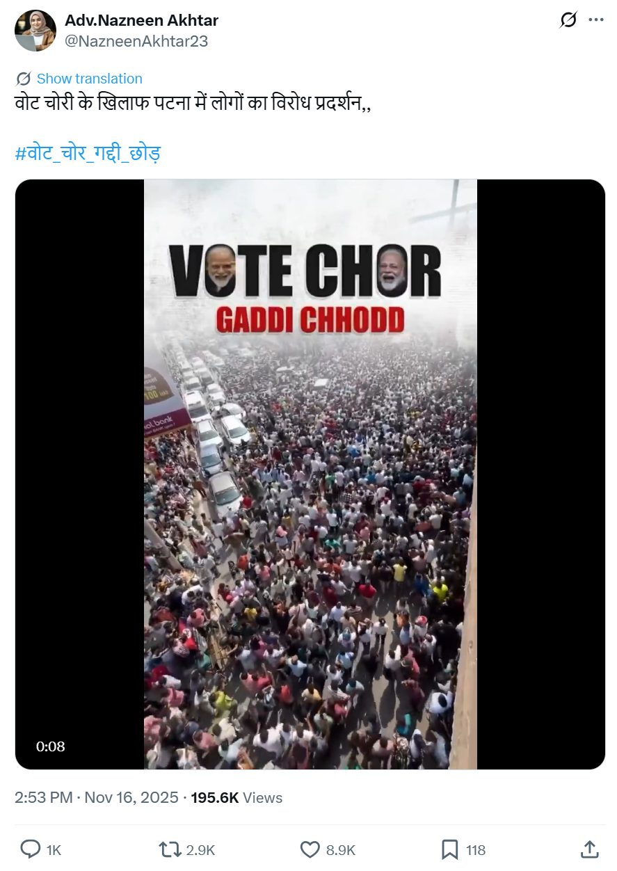 नाज़नीन अख्तर नामक यूज़र ने ये वीडियो पोस्ट करते हुए लिखा कि पटना में लोग ‘वोट चोरी’ के खिलाफ लोग विरोध प्रदर्शन कर रहे हैं. (आर्काइव लिंक)
