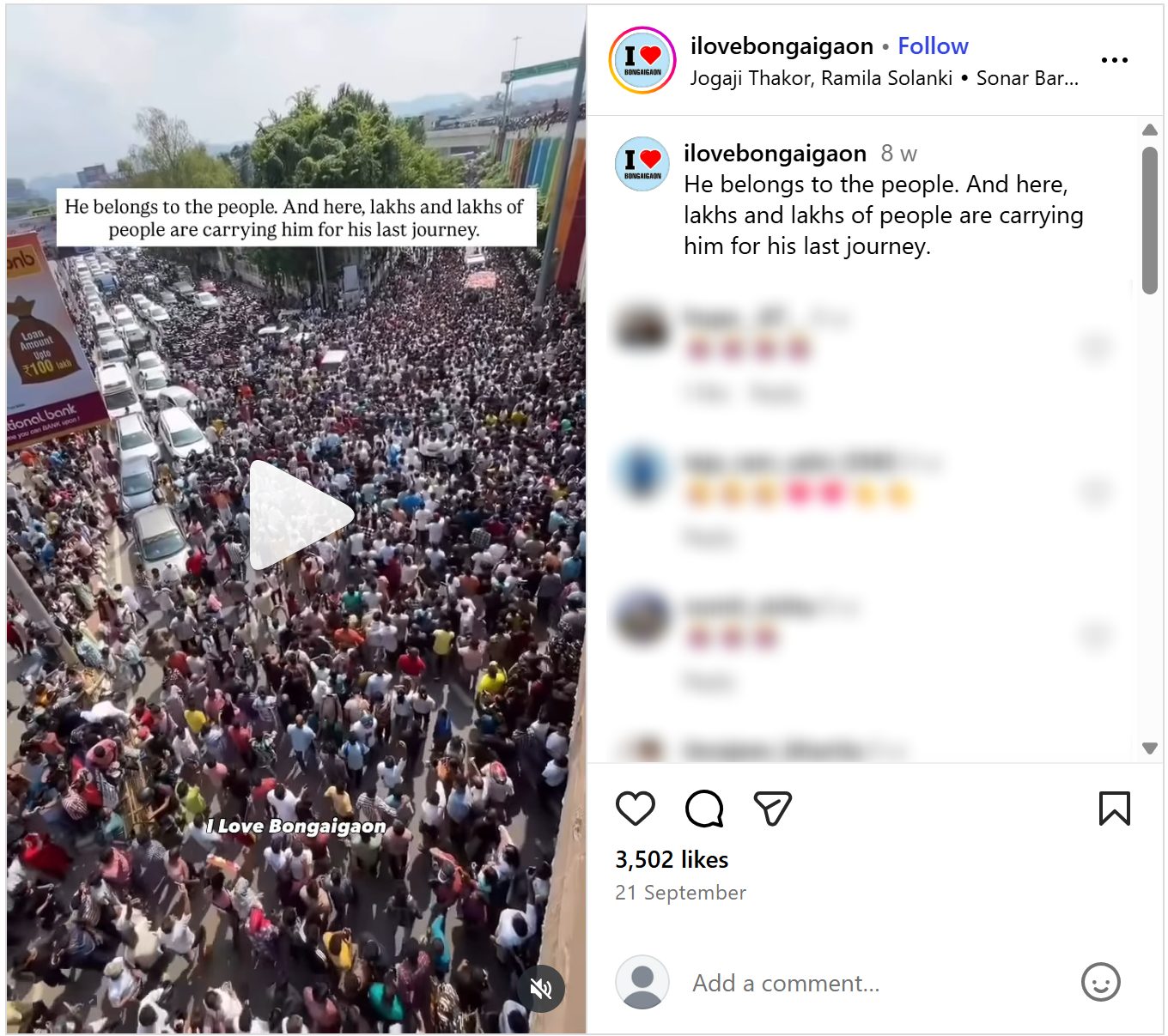 वायरल वीडियो के फ़्रेम्स को रिवर्स इमेज सर्च करने पर ऑल्ट न्यूज़ को ये वीडियो ‘ilovebongaigaon‘ के इंस्टाग्राम अकाउंट द्वारा 21 सितंबर 2025 को अपलोड किया हुआ मिला. कैप्शन में लिखा है कि “वो जनता के हैं और यहाँ लाखों लोग उनकी अंतिम यात्रा में शामिल हैं.” इससे इतना तो साफ है कि ये वीडियो बिहार चुनाव से पहले का है.